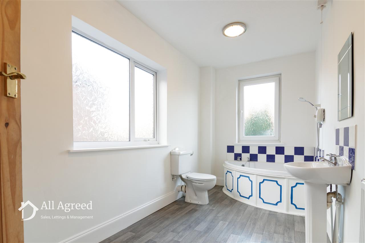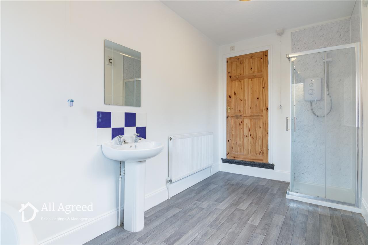Having suite comprising corner bath with electric shower over, shower cubical, pedestal wash basin, low flush W.C, extractor fan, central heating radiator and UPVC double glazed opaque windows to the side and rear elevations.
