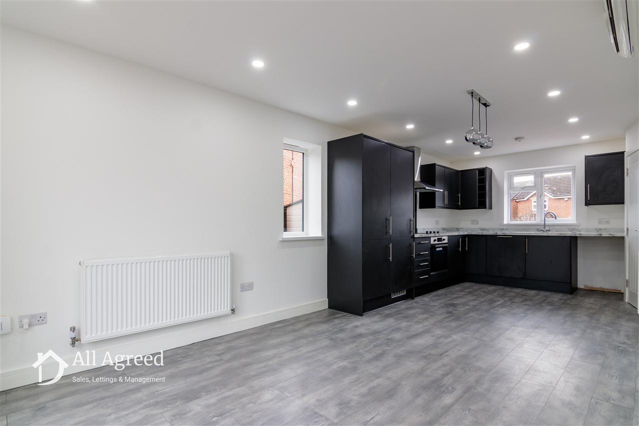 Open plan living with fitted kitchen having squared edge worktops, stainless steel sink unit with mixer tap integrated fridge/freezer, dishwasher, electric oven, four ring electric hob, stainless steel extractor hoods, appliance space for washing machine, uPVC double glazed windows to side and rear elevation, 2 x central heating radiators, air conditioning unit , TV point and bi-fold doors opening to the rear garden.