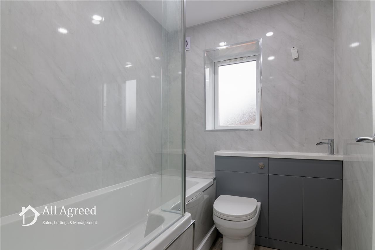 Having a three piece suite featuring L-shaped bath with electric shower over and glass screen, vanity unit with WC and wash basin, chrome effect heated towel rail, extractor fan and opaque uPVC double glazed window to the side elevation.