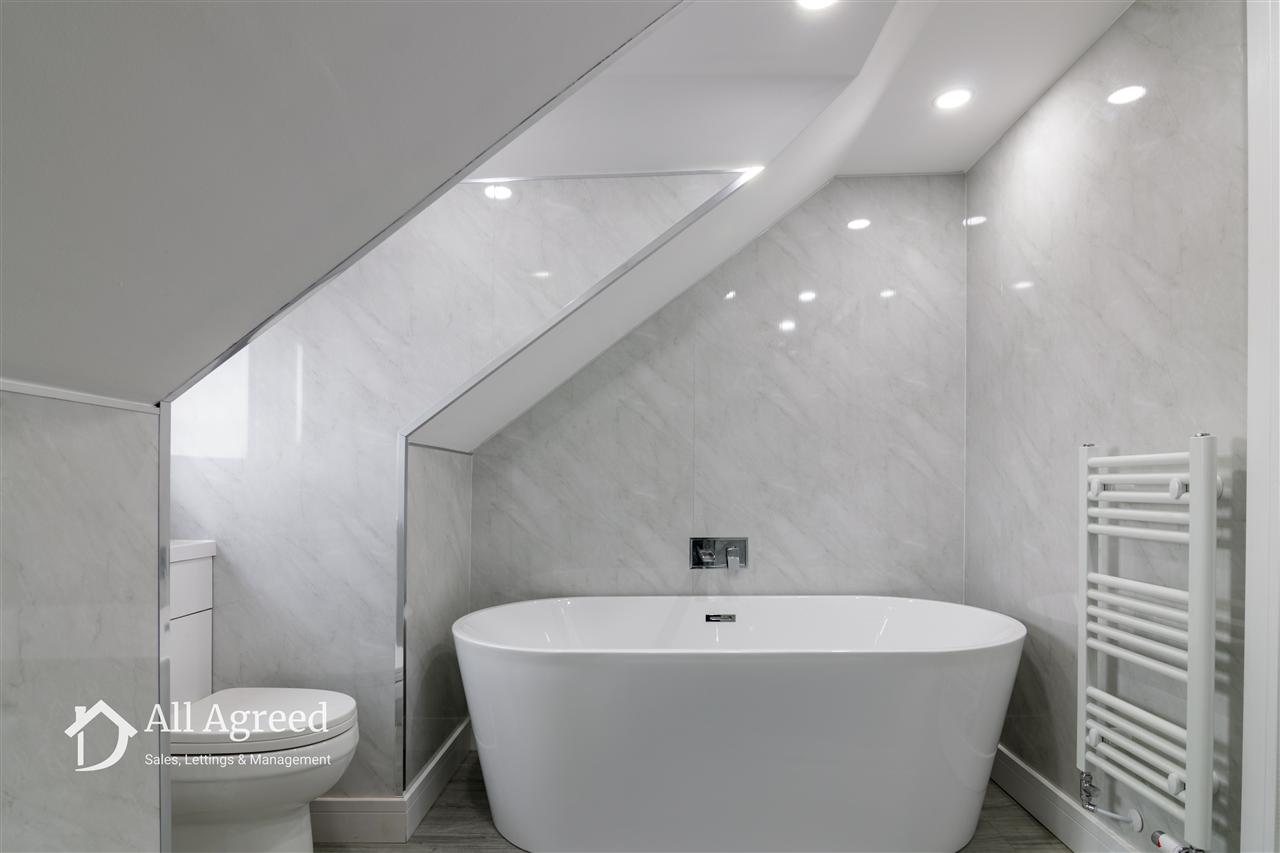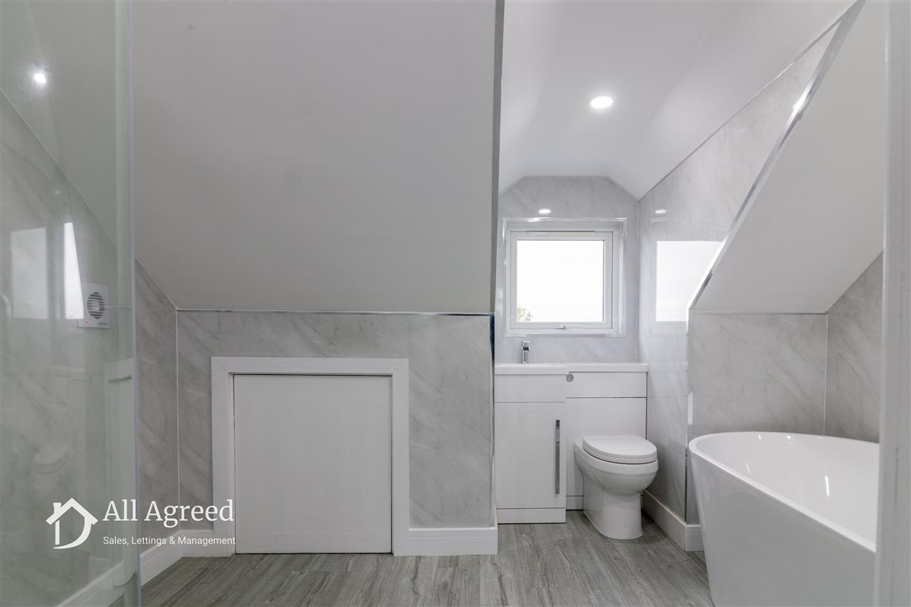 Having a four piece suite with double ended bath, shower cubicle with mains water fed shower, vanity unit with wash basin and WC, chrome effect heated towel rail, storage eaves, extractor fan and uPVC double glazed window to the front elevation.