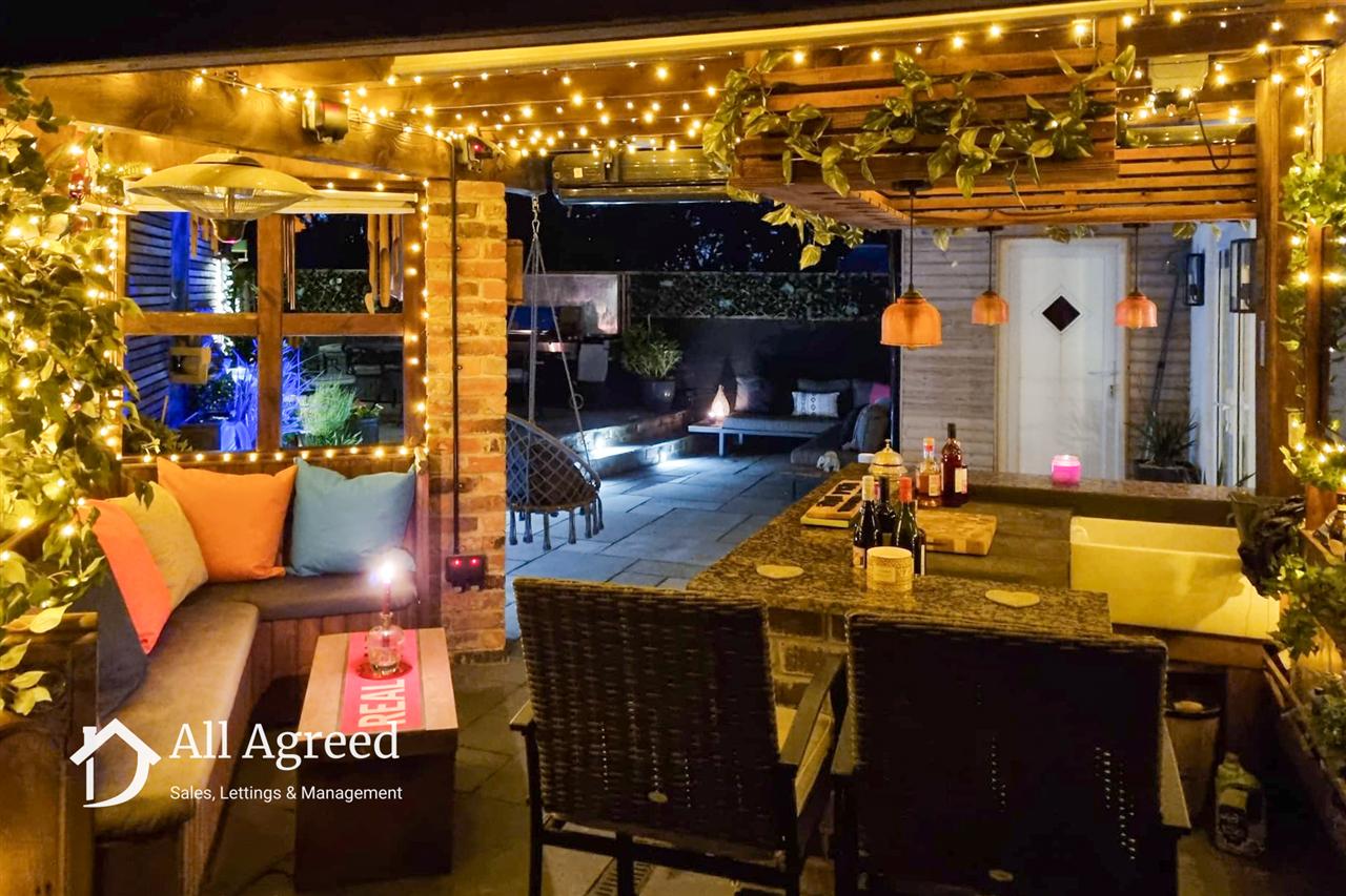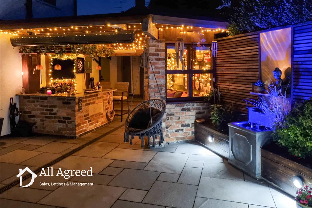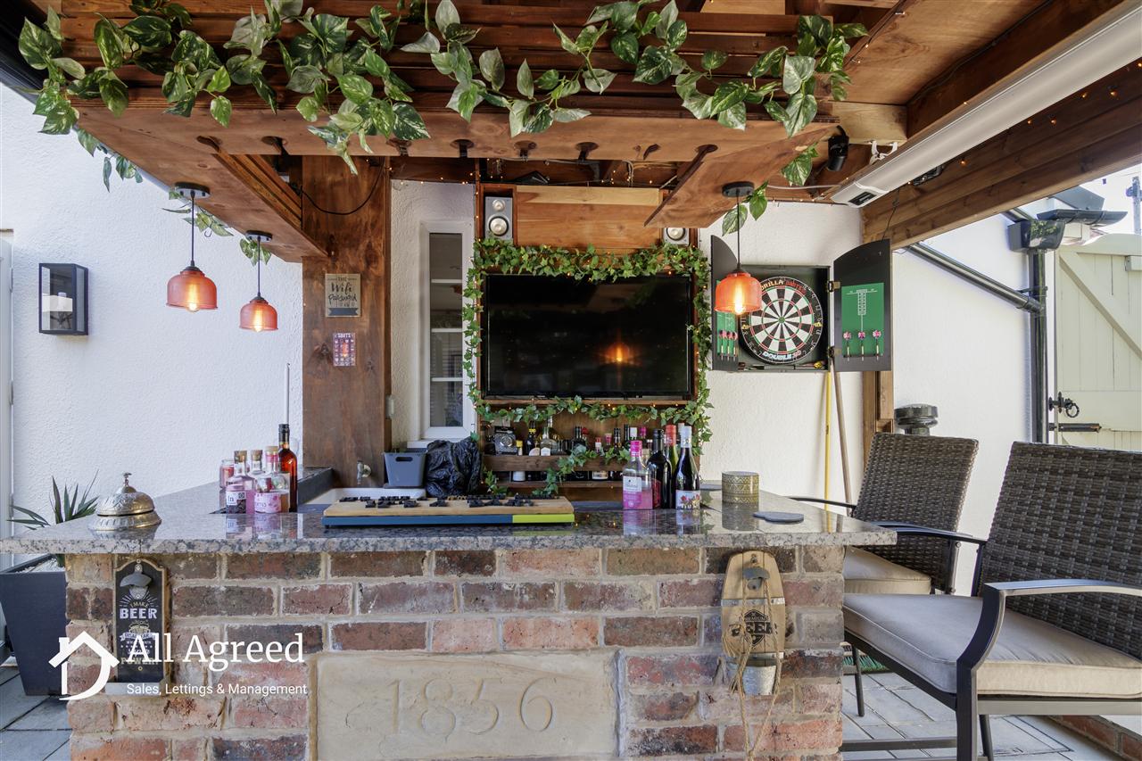 The rear garden is a standout feature: fully paved for ease of maintenance and beautifully designed for social gatherings, including a purpose-built brick bar area, seating and outside lights — ideal for summer evenings with friends and family. Driveway parking is available to the front, and local amenities, shops, schools and transport links are all within easy reach.
