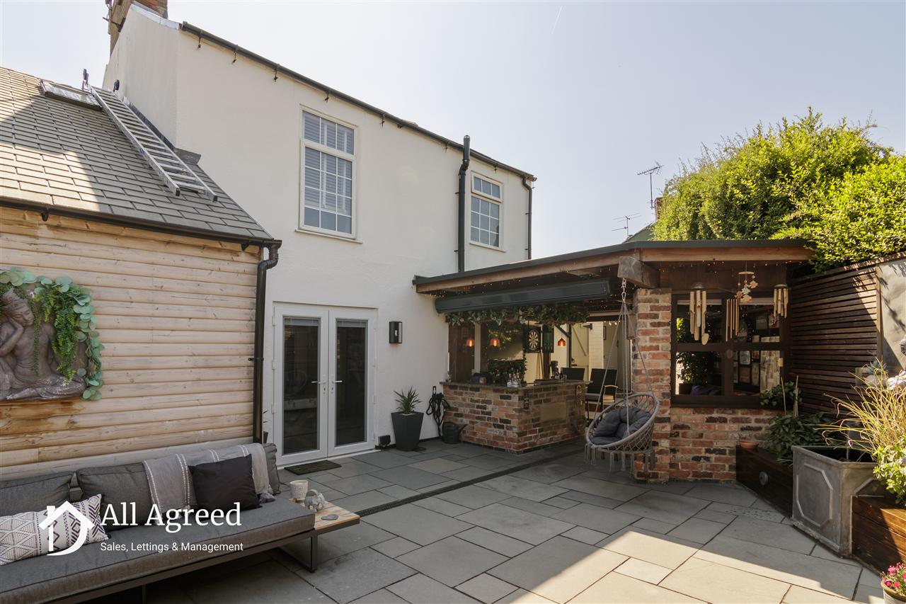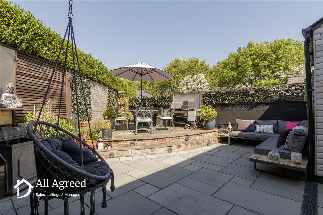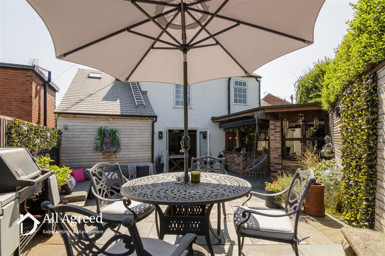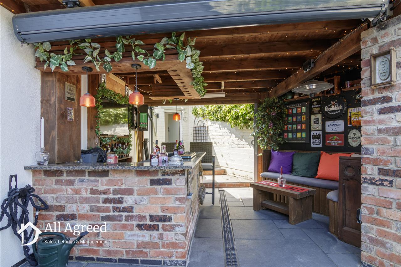 The rear garden is a standout feature: fully paved for ease of maintenance and beautifully designed for social gatherings, including a purpose-built brick bar area, seating and outside lights — ideal for summer evenings with friends and family. Driveway parking is available to the front, and local amenities, shops, schools and transport links are all within easy reach.