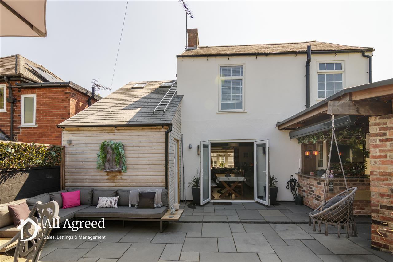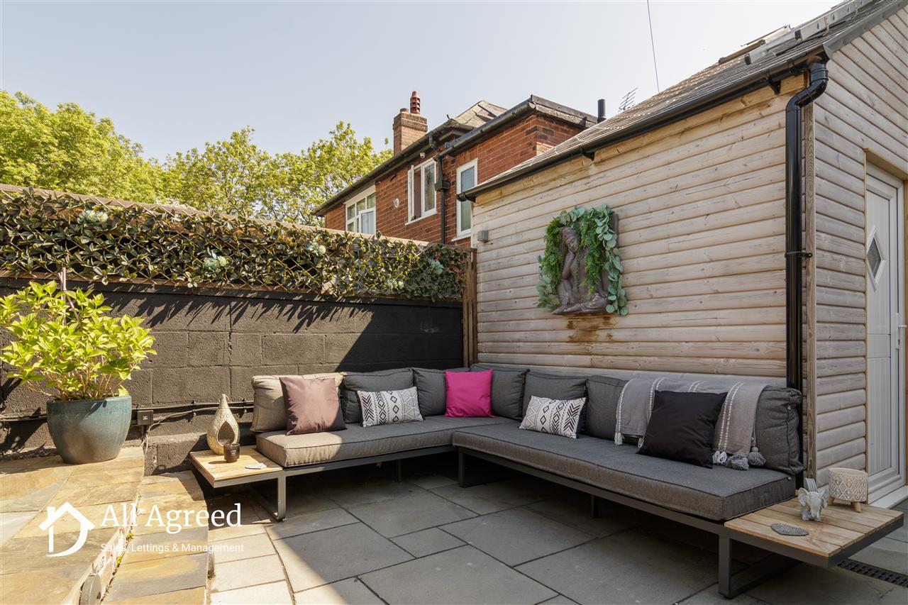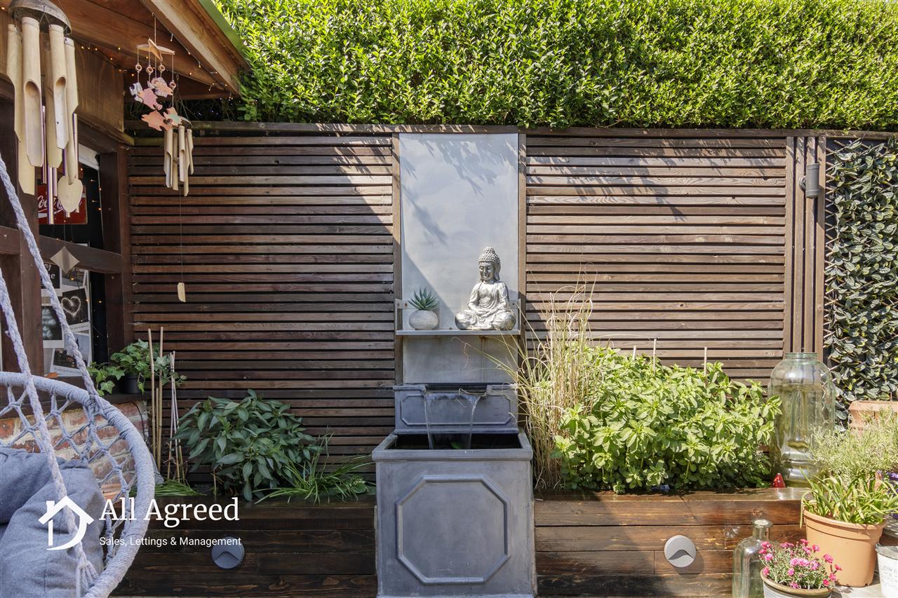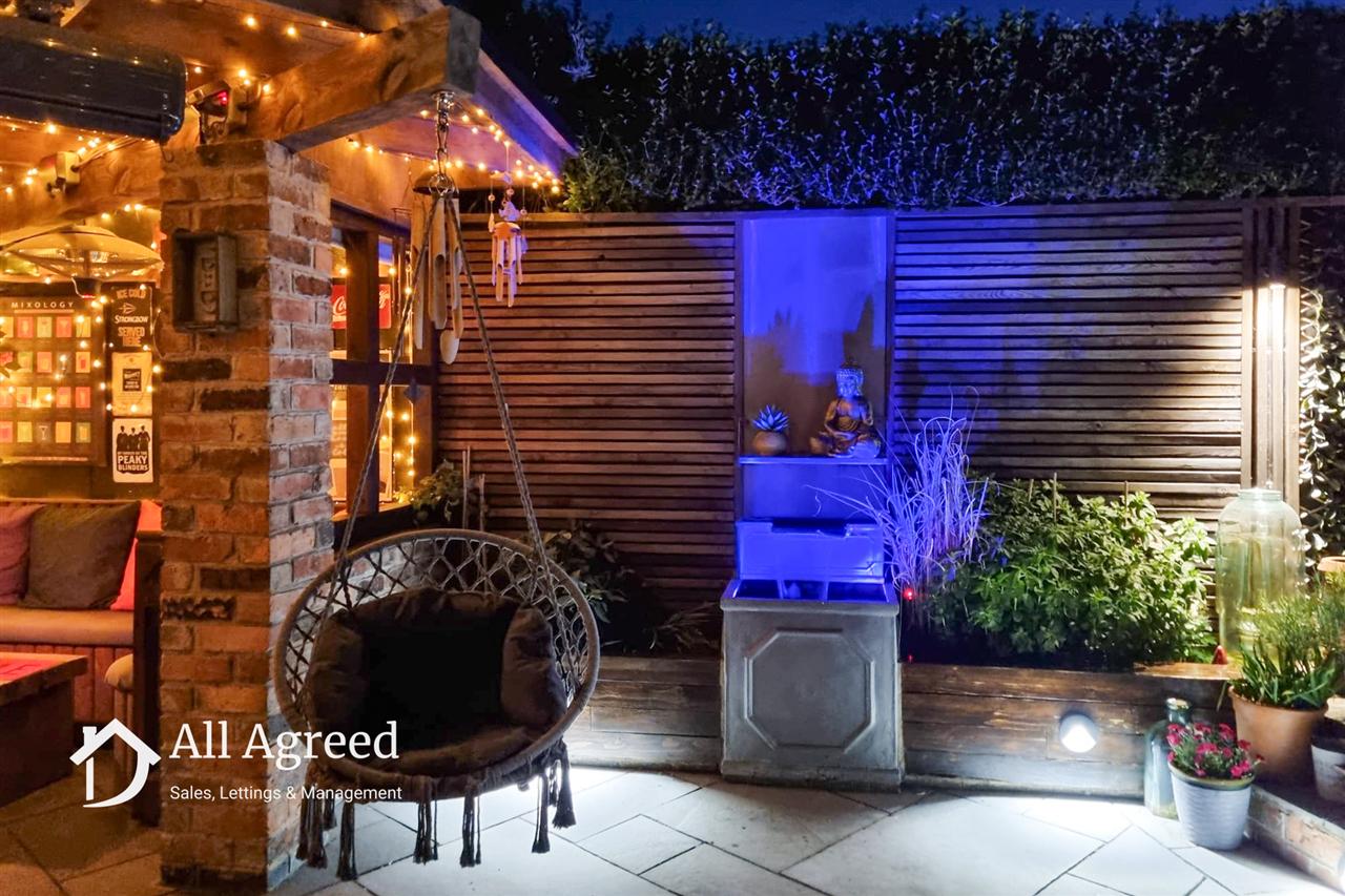 The rear garden at The Retreat is a beautifully designed, low-maintenance space perfect for entertaining or relaxing. Fully paved and zoned for outdoor living, it features a raised dining terrace, a stylish lounge area, feature Buddha water fountain and a superb covered brick bar with built-in seating. The bar is fully equipped with a Belfast sink, power, space for a fridge, and a retractable shutter screen — ideal for all-weather use.