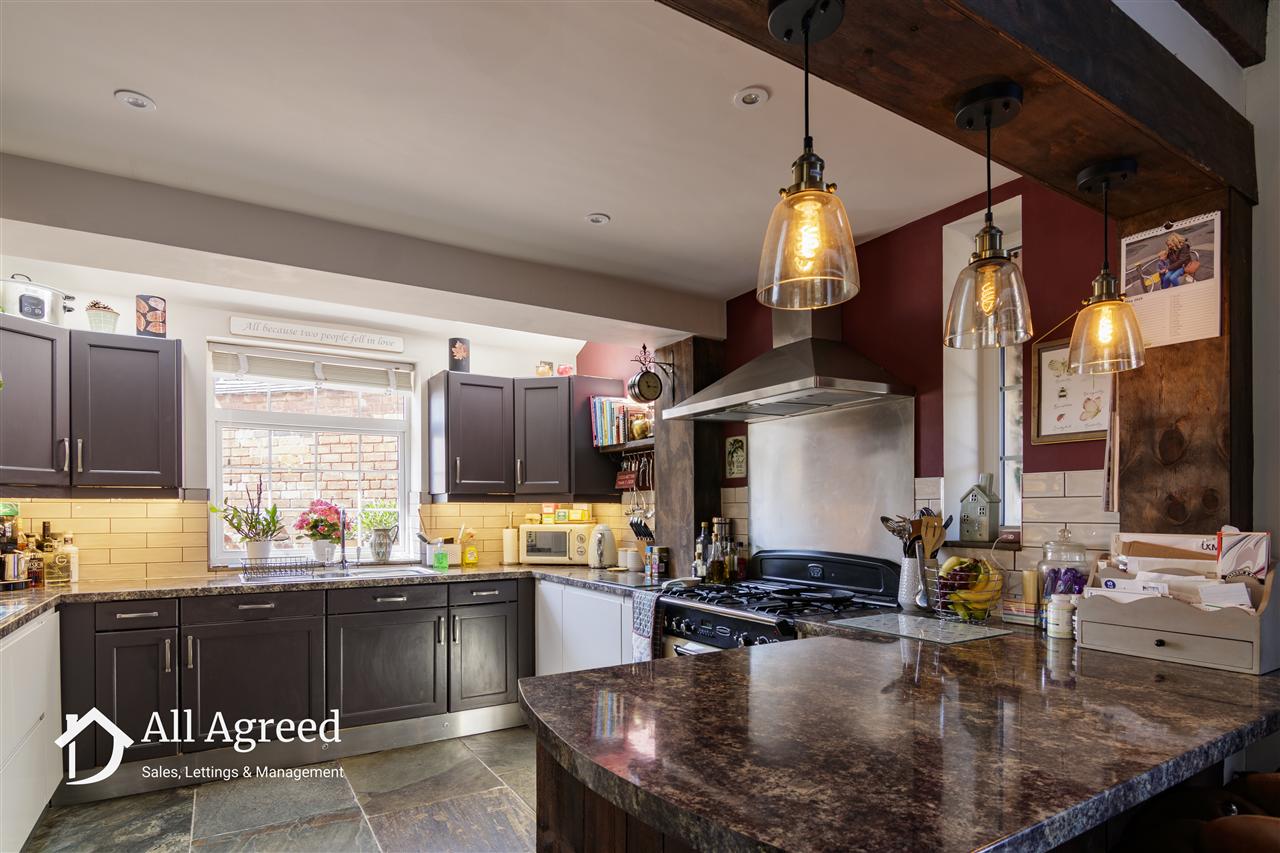 Enjoying an open aspect from the dining area partly separated by a breakfast bar, featuring a range of high and low level units with laminate worktops, under-cabinet lighting, plinth lights, Rangemaster duel fuel (electric and gas) cooker with five ring gas hob, stainless steel extractor hood, stainless steel sink unit with mixer tap, integrated dishwasher, space for American style fridge/freezer, slate floor, 2 x Velux roof lights and uPVC double glazed window to the side elevation.
