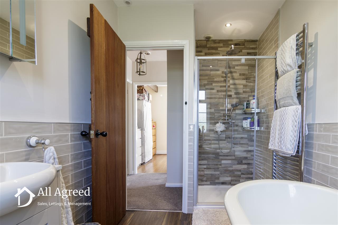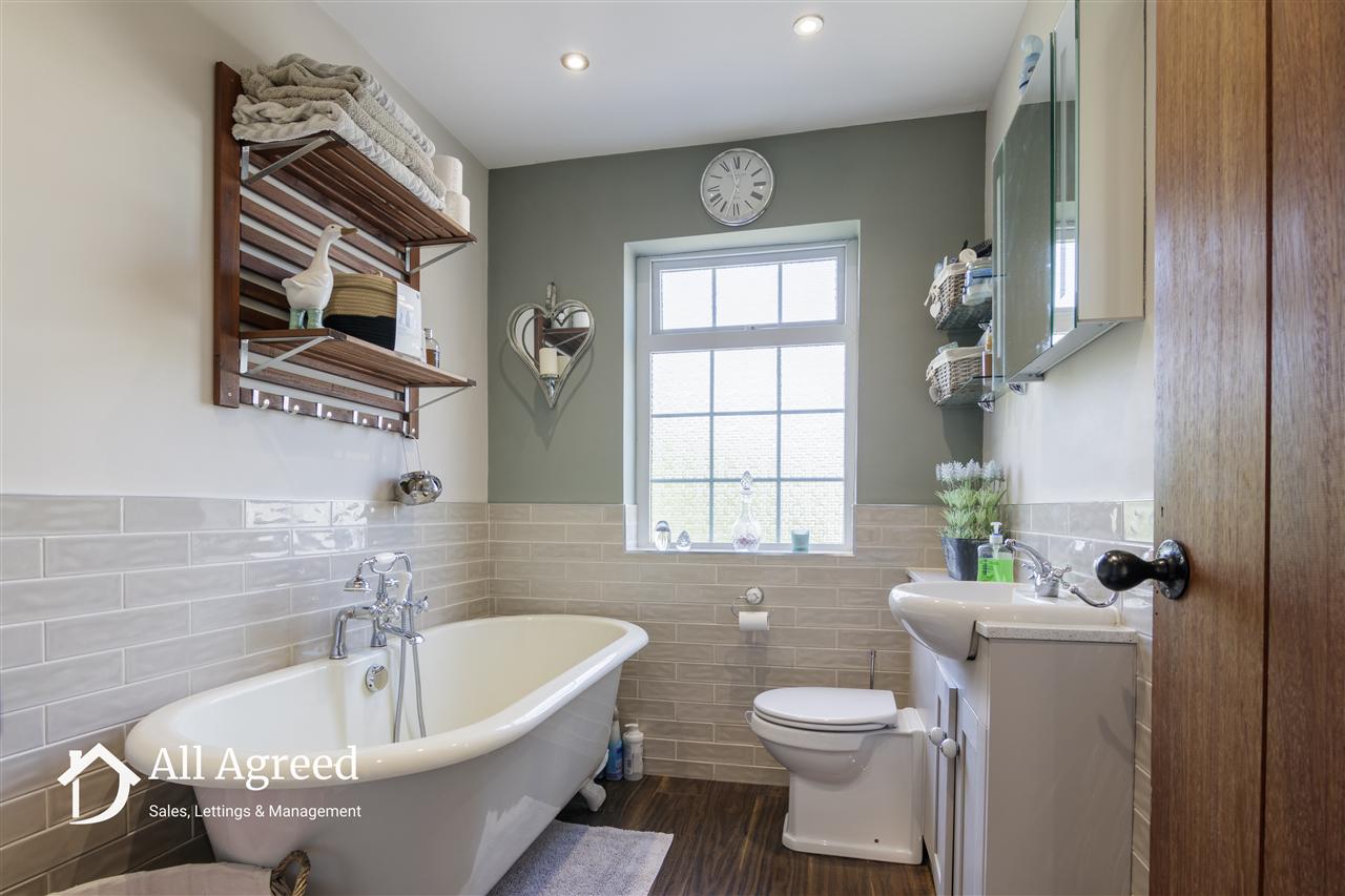 Having a four piece bathroom suite comprising rolled top bath, vanity unit with wash basin, low flush WC and separate recessed shower cubicle with twin head rainfall shower, partly tiled walls, spotlights, and opaque uPVC double glazed window to the rear elevation.