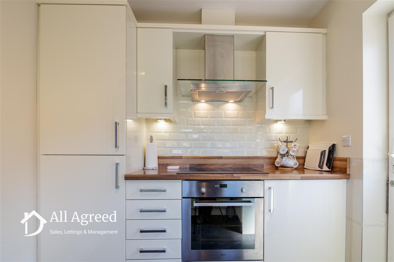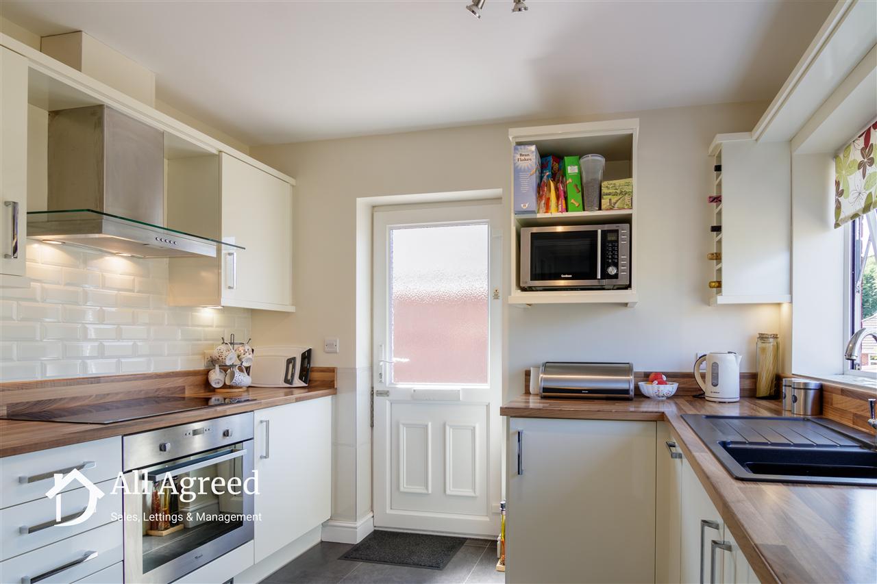 Having a range of modern wall and base units with rolled edge work surfaces and complimentary splashback tiling, integrated dishwasher, washing machine, fridge freezer and electric oven, four ring electric hob with stainless steel extractor hood, composite sink with mixer tap, tiled floor, uPVC side access door and uPVC double glazed window to the front elevation.