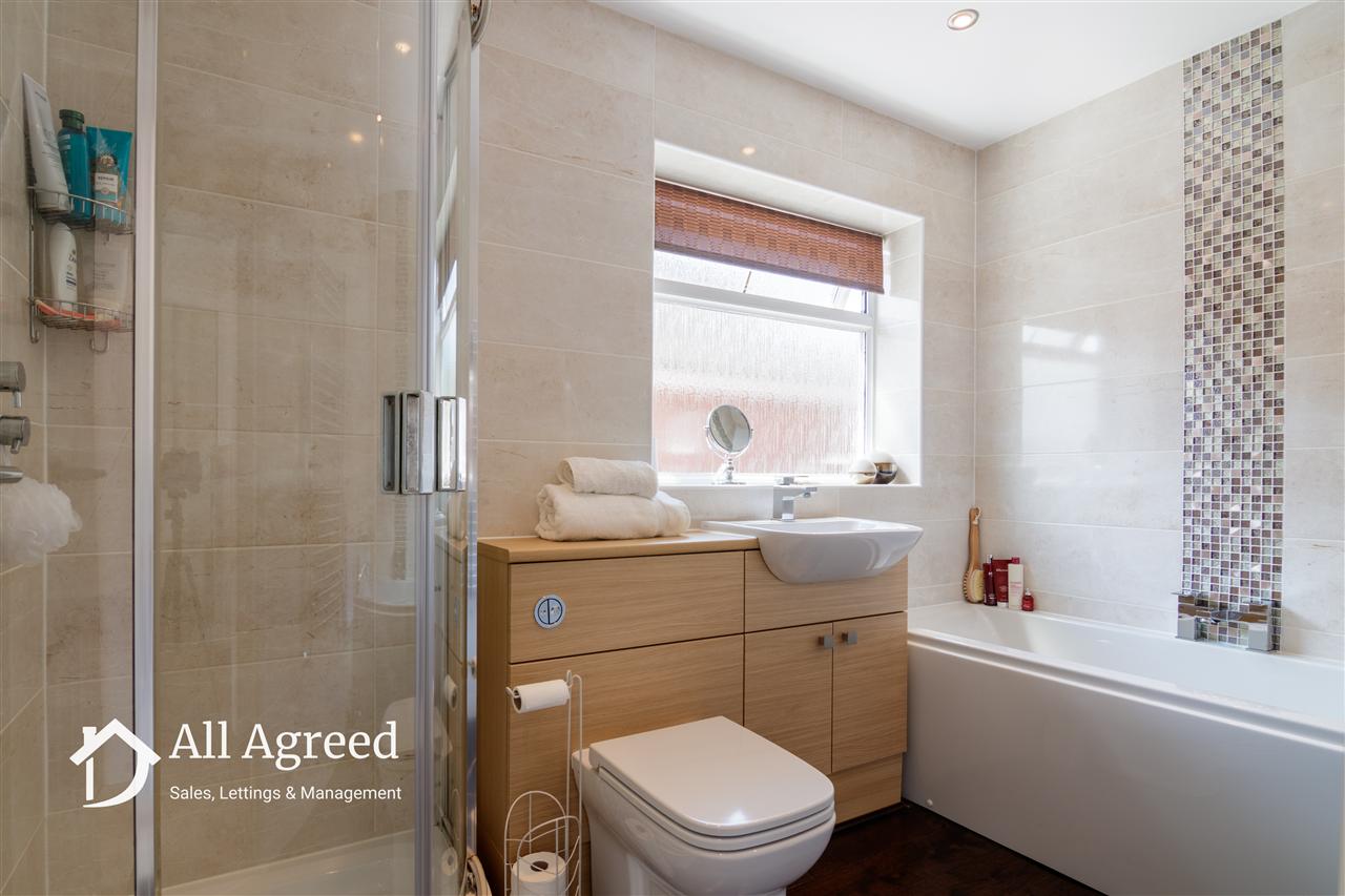 Having a four piece bathroom suite comprising corner shower cubicle with mains water fed thermostatic shower, panelled bath, vanity unit with wash basin and WC, tiled wall, solid wood flooring, chrome heated towel rail, extractor fan, spotlights and opaque uPVC double glazed window to the side elevation.