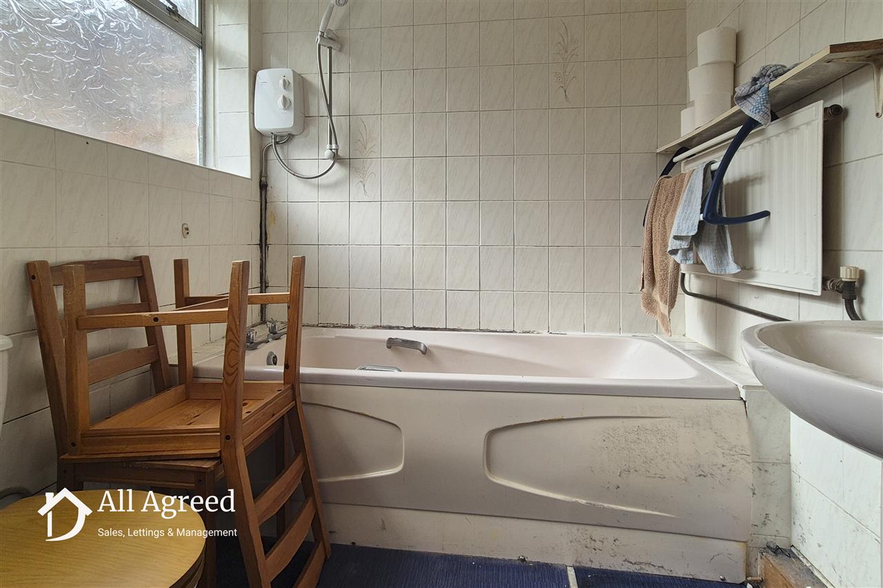 Panelled bath, pedestal wash basin, low flush WC, tiled walls, opaque aluminium double glazed window to the rear elevation, wall mounted gas boiler and central heating radiator.