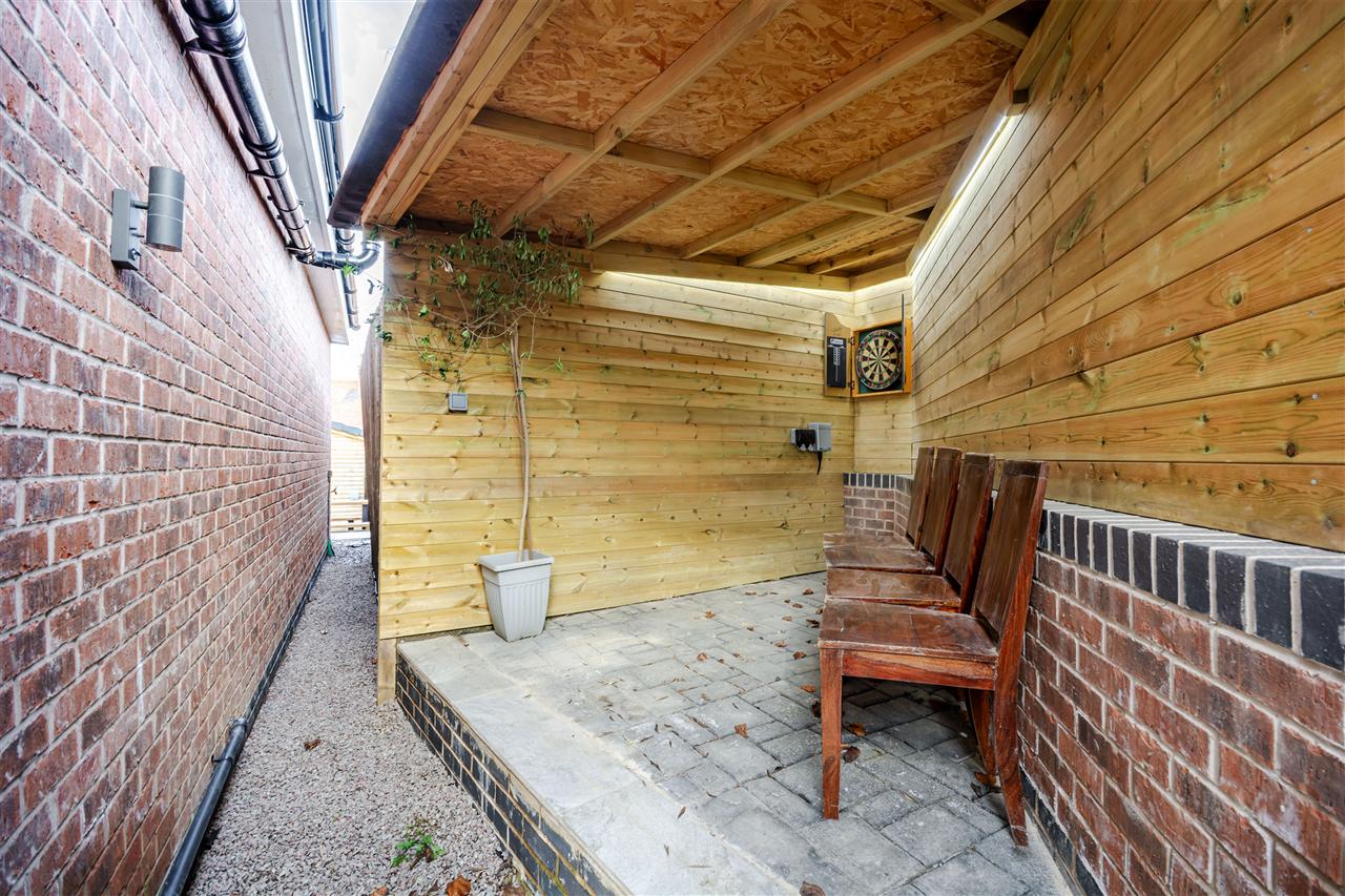 A landscaped, low-maintenance rear garden featuring paved seating areas, artificial lawn, fenced boundaries, external lighting and power points. There is a further covered seating area to the side elevation which also benefits from power and lighting.