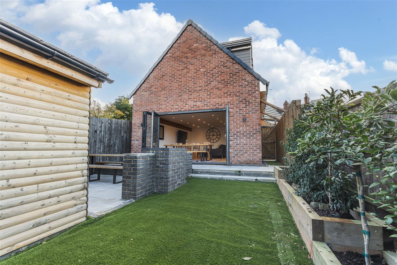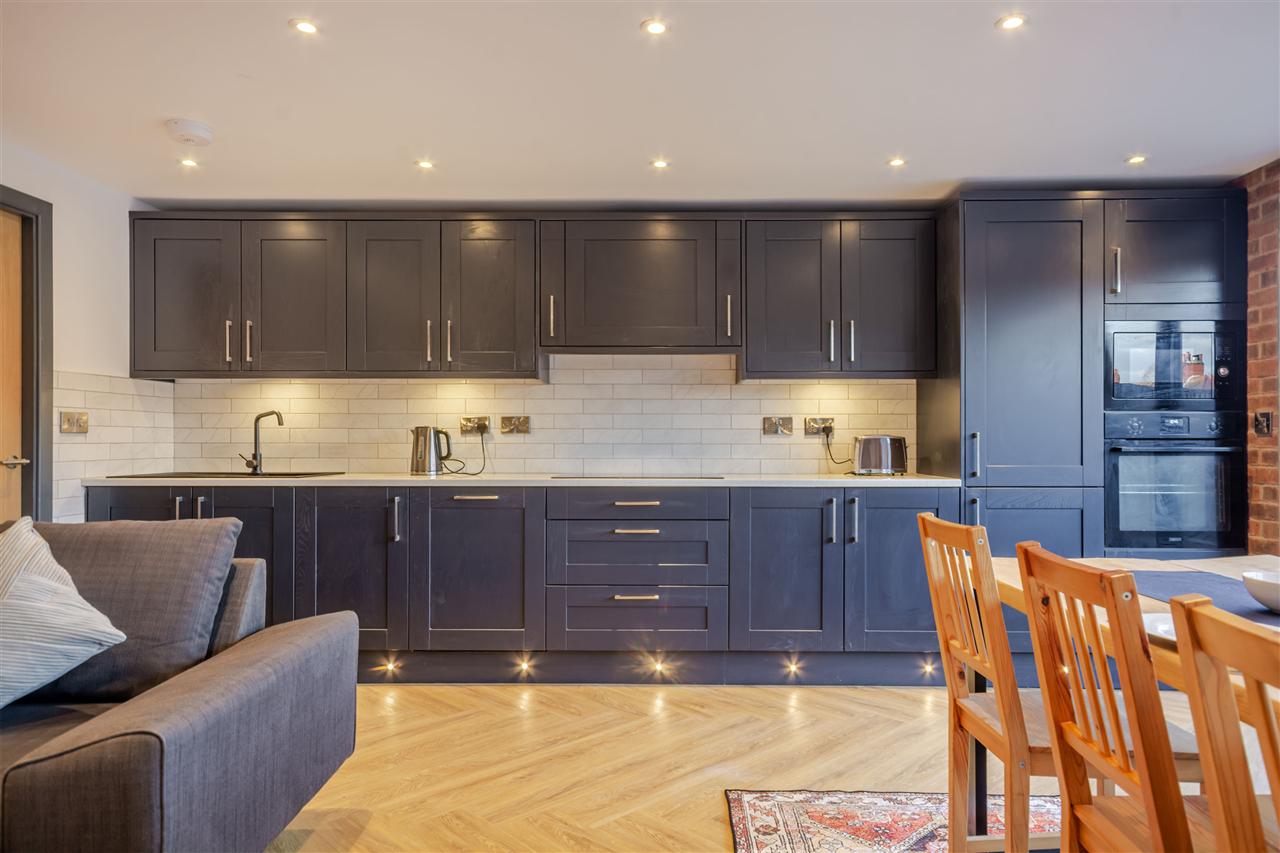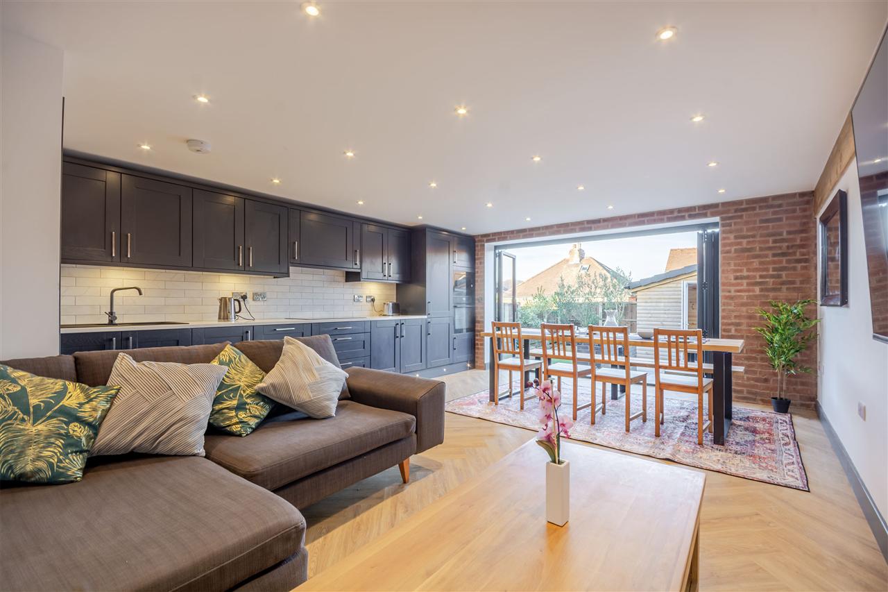 The property is entered via a welcoming hallway featuring quality timber joinery and a bespoke staircase. The ground floor features a stunning open-plan living kitchen, designed to maximise space and natural light. The kitchen is fitted with a comprehensive range of modern units, integrated appliances and quality work surfaces, flowing seamlessly into the dining and living area. Full-width bi-fold doors open directly onto the rear garden, along with a versatile third bedroom, a separate shower room and a separate utility cupboard. Karndean flooring with underfloor heating runs throughout the ground floor accommodation. The first floor provides two generous double bedrooms, both benefiting from their own en-suites. Architectural features including vaulted ceilings, skylights and exposed brickwork add individuality and character.