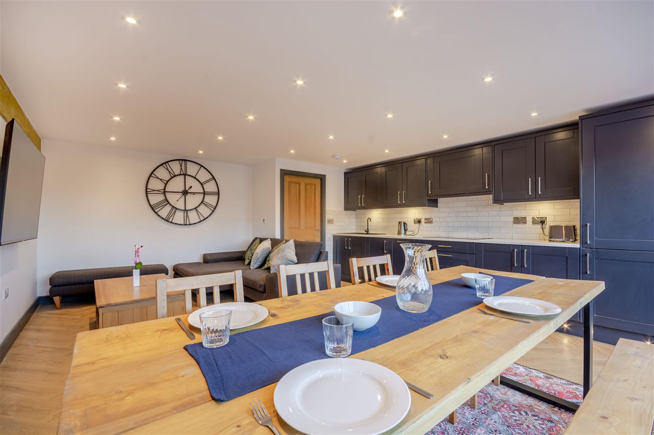 A spacious and well-designed open-plan living kitchen. The kitchen area is fitted with a range of modern wall and base units with complementary work surfaces, integrated appliances, inset sink with mixer tap and tiled splashbacks.