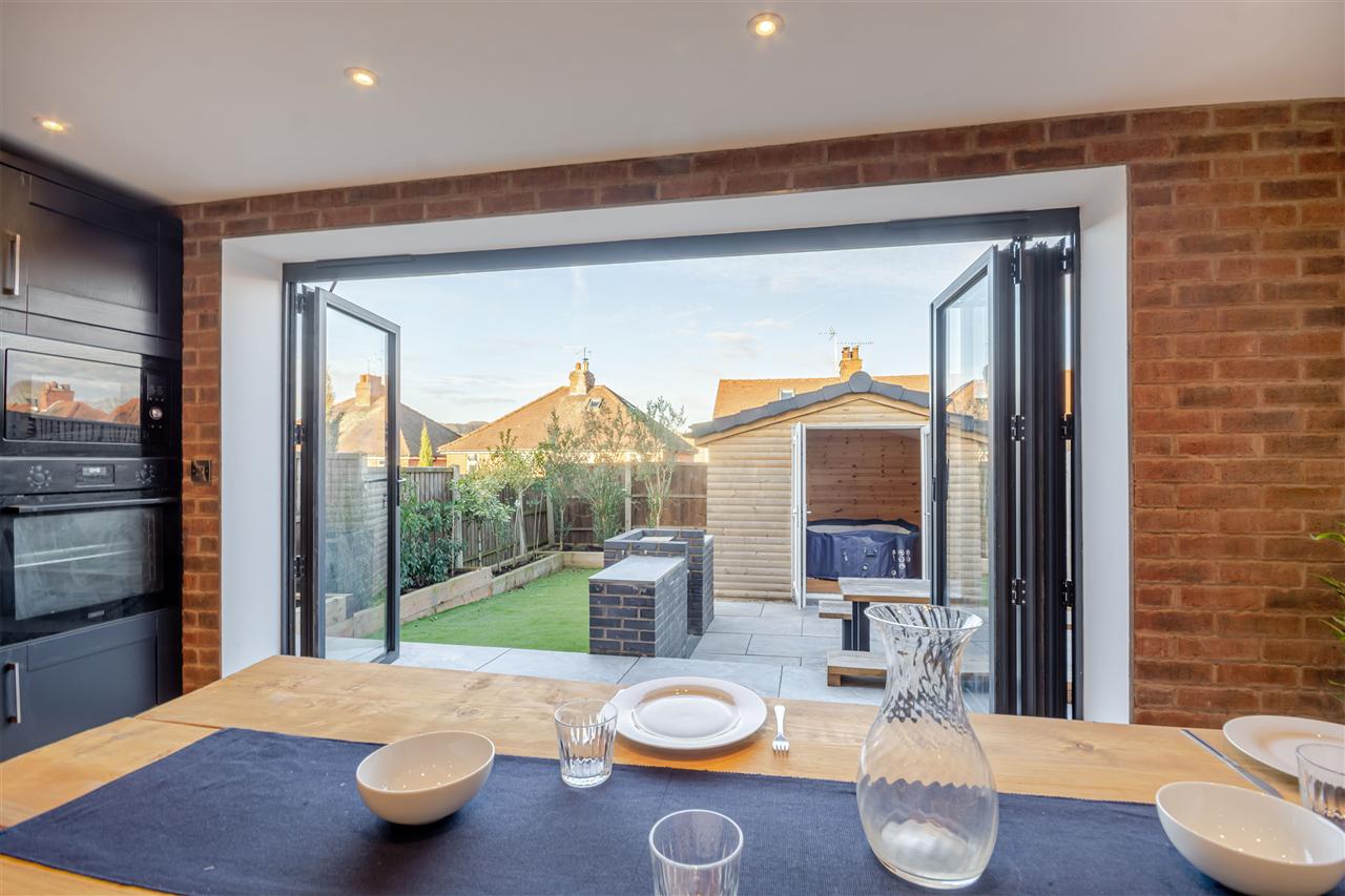 The living and dining areas offer generous space for furniture and benefit from UPVC double glazed bi-fold doors opening directly onto the rear garden. Additional features include wood-effect flooring, multiple power points and recessed ceiling lighting throughout.