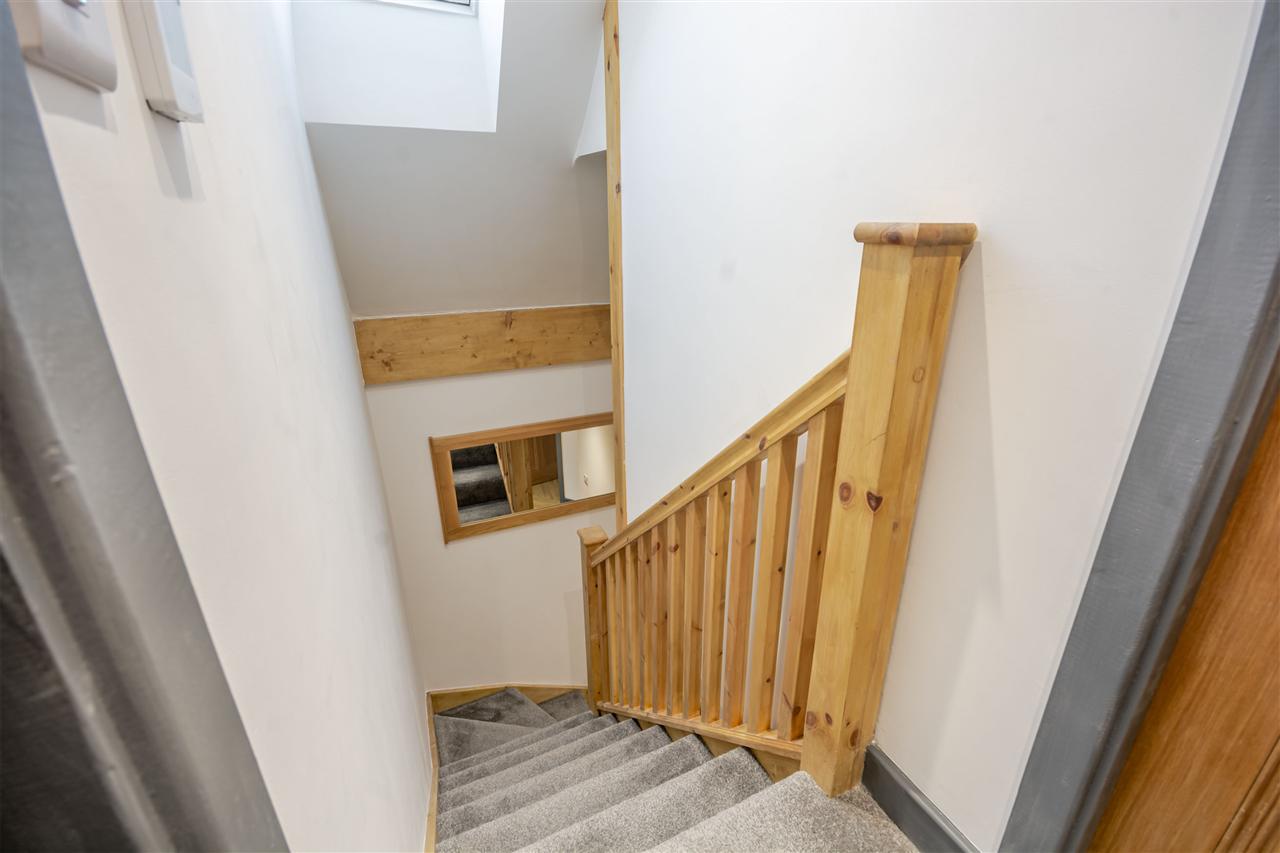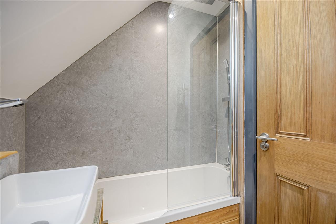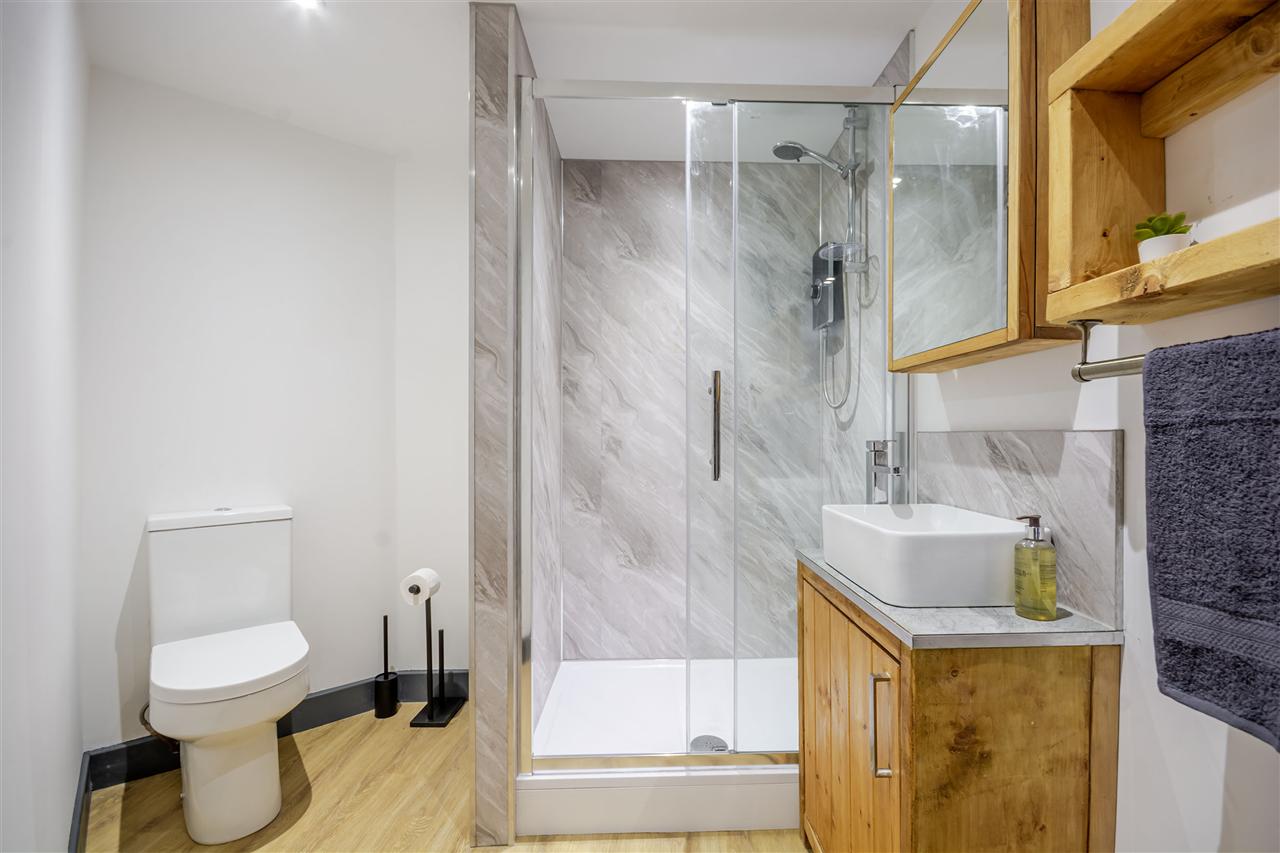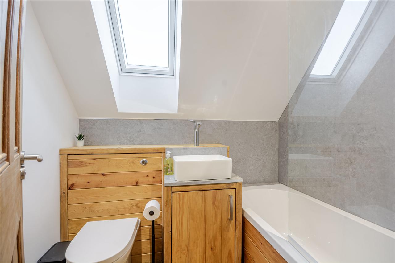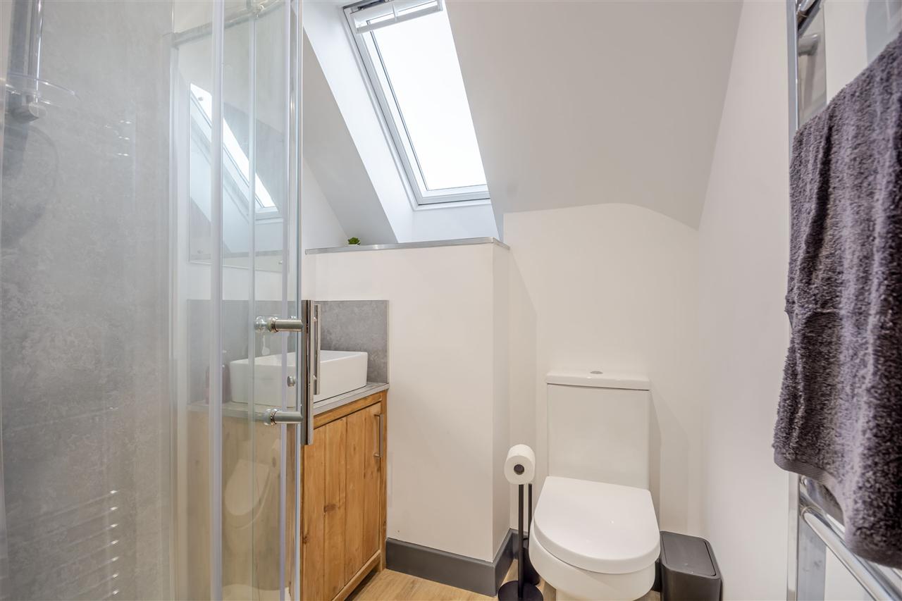 Fitted with a modern suite including shower enclosure, wash hand basin and low-level WC, heated towel rail, extractor fan, ceiling spotlights and Velux window.