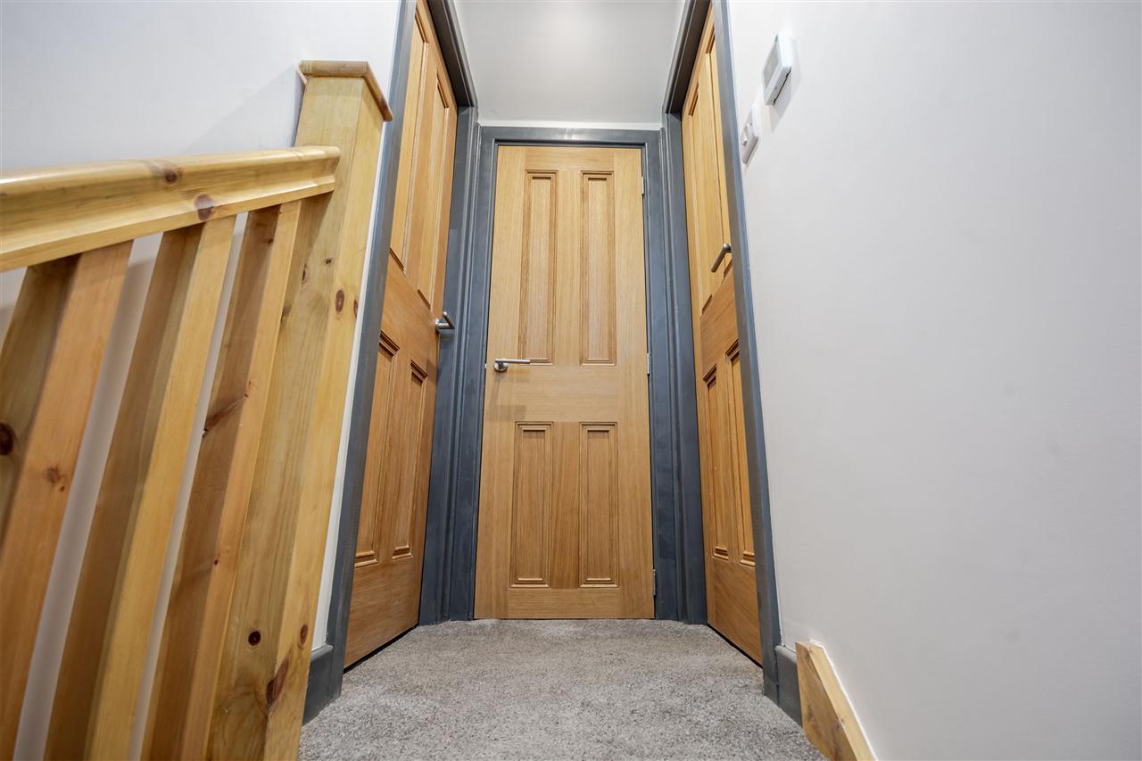 The staircase leads to landing area with skylight windows providing natural light, carpeted flooring and inset ceiling spotlights. Doors provide access to both first floor bedrooms.