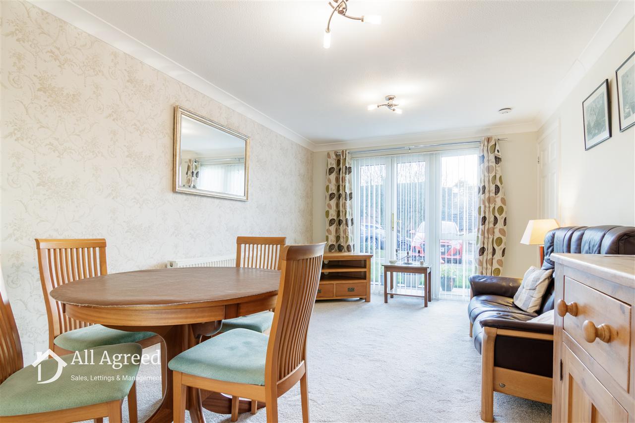 The ground floor accommodation comprises an entrance hall with staircase rising to the first floor, a lounge with double doors opening onto the rear patio, and a fitted kitchen an adaptable bedroom/dining room, along with a utility/WC. To the first floor are two further bedrooms, including a generous principal bedroom with fitted wardrobes and storage, together with a modern shower room. Externally, the property benefits from a parking space to the front elevation. To the rear is a patio area with access to well-maintained communal gardens, enjoying attractive open countryside views beyond.