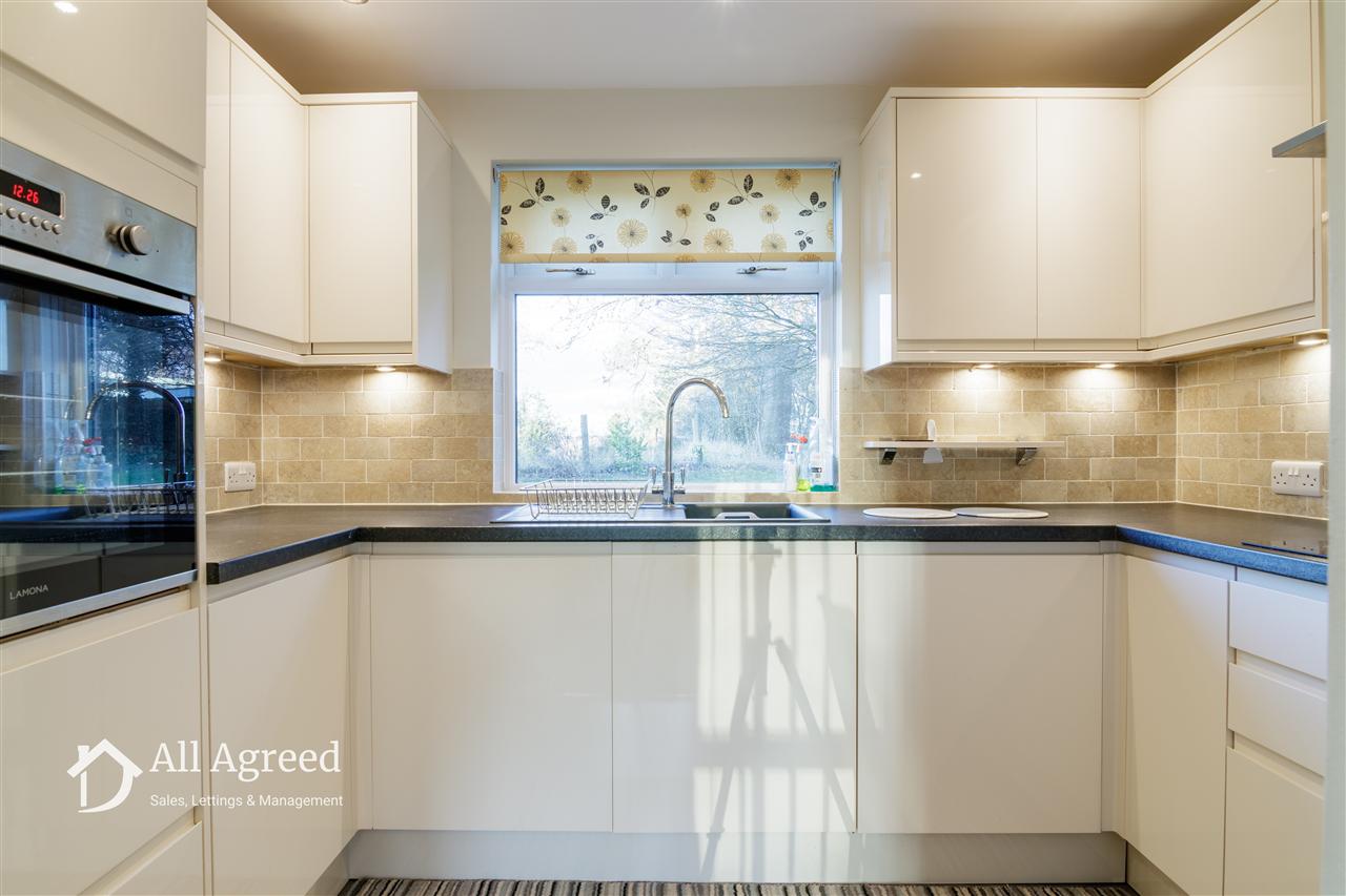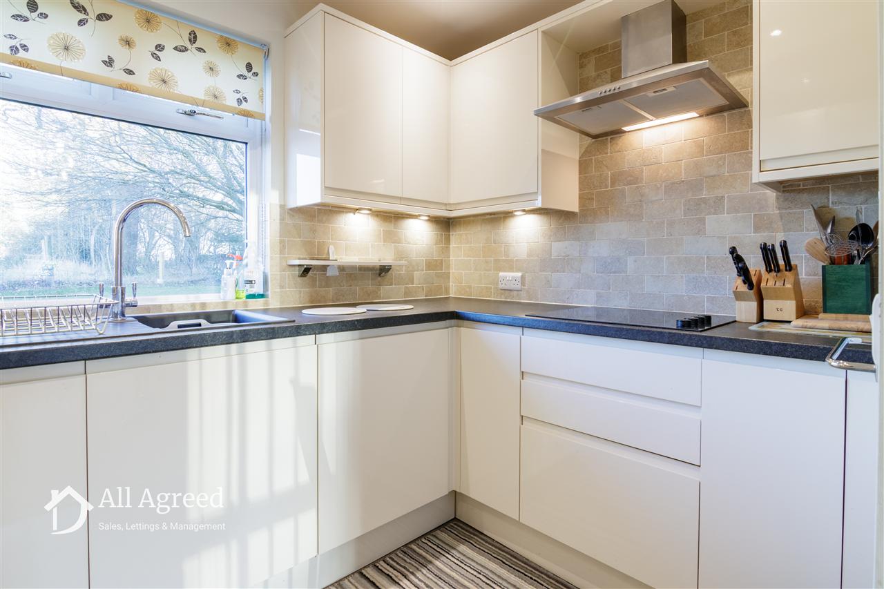 A modern fitted kitchen with rolled edge worktops, composite sink unit, integrated fridge and dishwasher, eye level electric oven, four ring electric hob, stainless steel extractor hood, complimentary splashback tiling, spotlights, under wall cabinet lighting and uPVC double glazed window to the rear elevation.