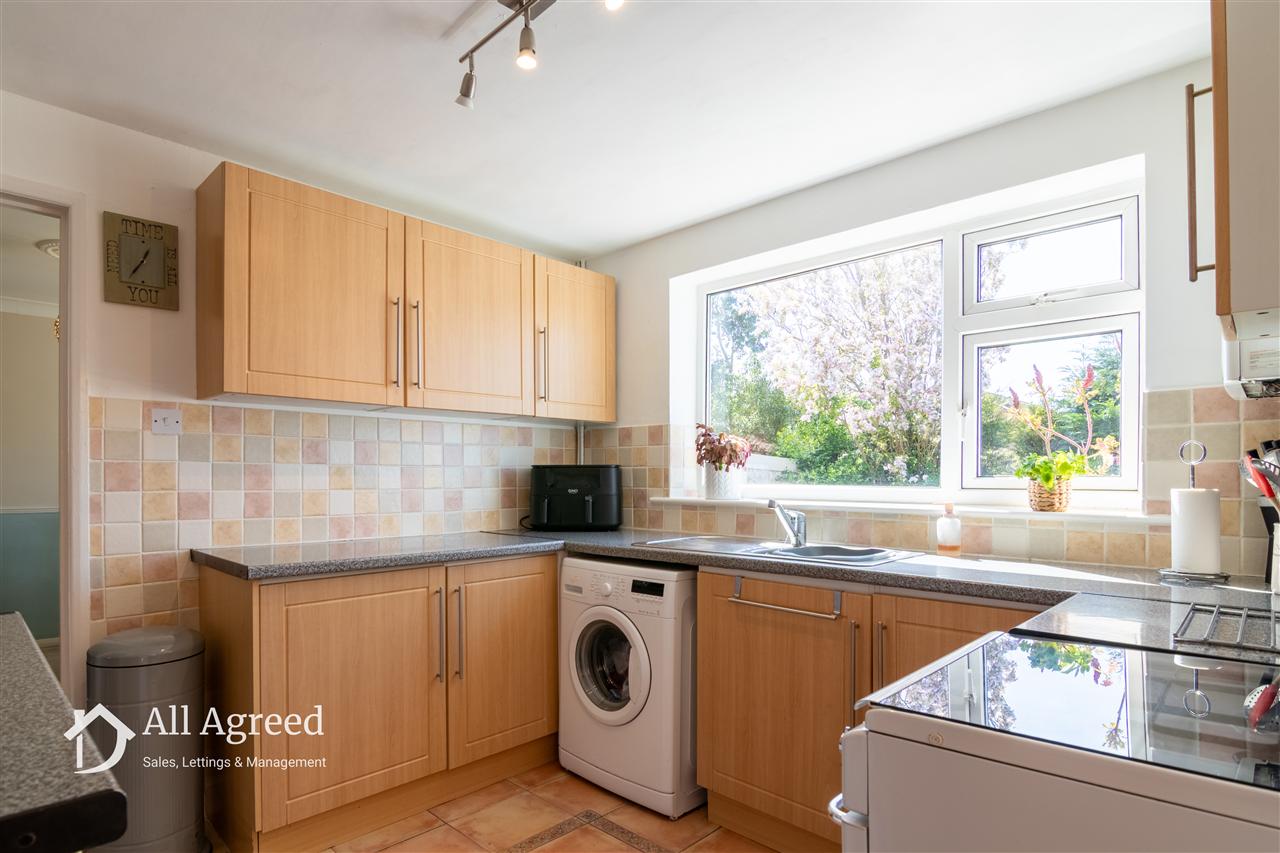 Having a range of wall and base units with rolled edge work surfaces incorporating a stainless steel sink unit with mixer tap. There are undercounter appliance spaces including fridge freezer and washing machine, along with space for a freestanding cooker. Tiled floor and splashbacks, wall-mounted gas combi boiler, uPVC double-glazed window to the rear elevation, and uPVC opaque double-glazed door providing side access.