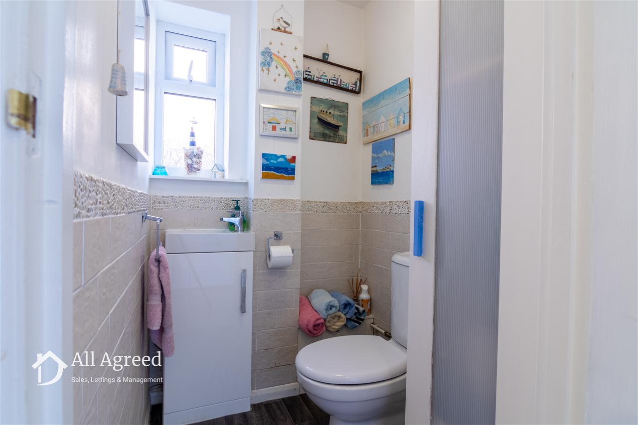 Fitted with a low flush WC and vanity wash basin, partly tiled walls, and opaque uPVC double-glazed window to the side elevation.