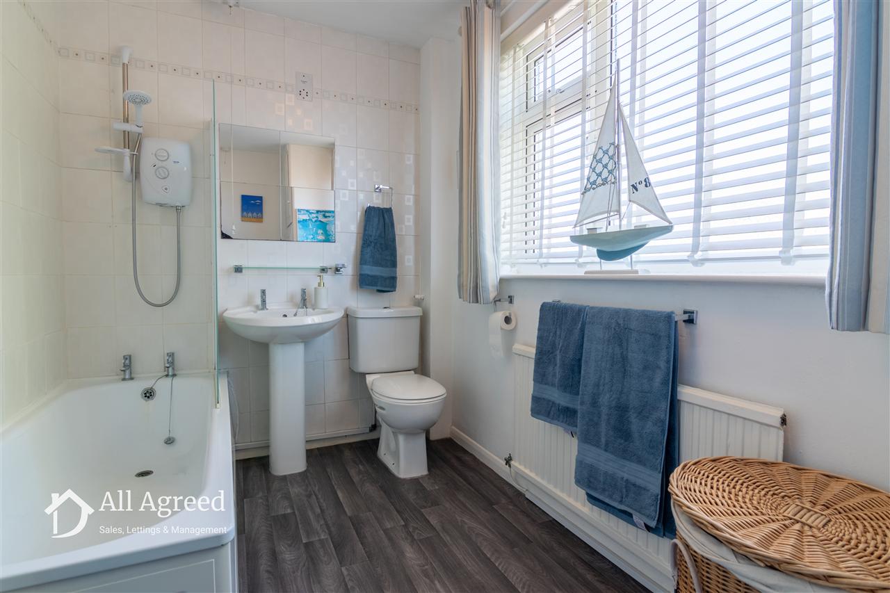 Fitted with a panelled bath with electric shower over and glass screen, pedestal wash basin, and low flush WC. Partly tiled walls, central heating radiator, shaver point, built-in storage cupboard (former airing cupboard), and opaque uPVC double-glazed window to the front elevation.
