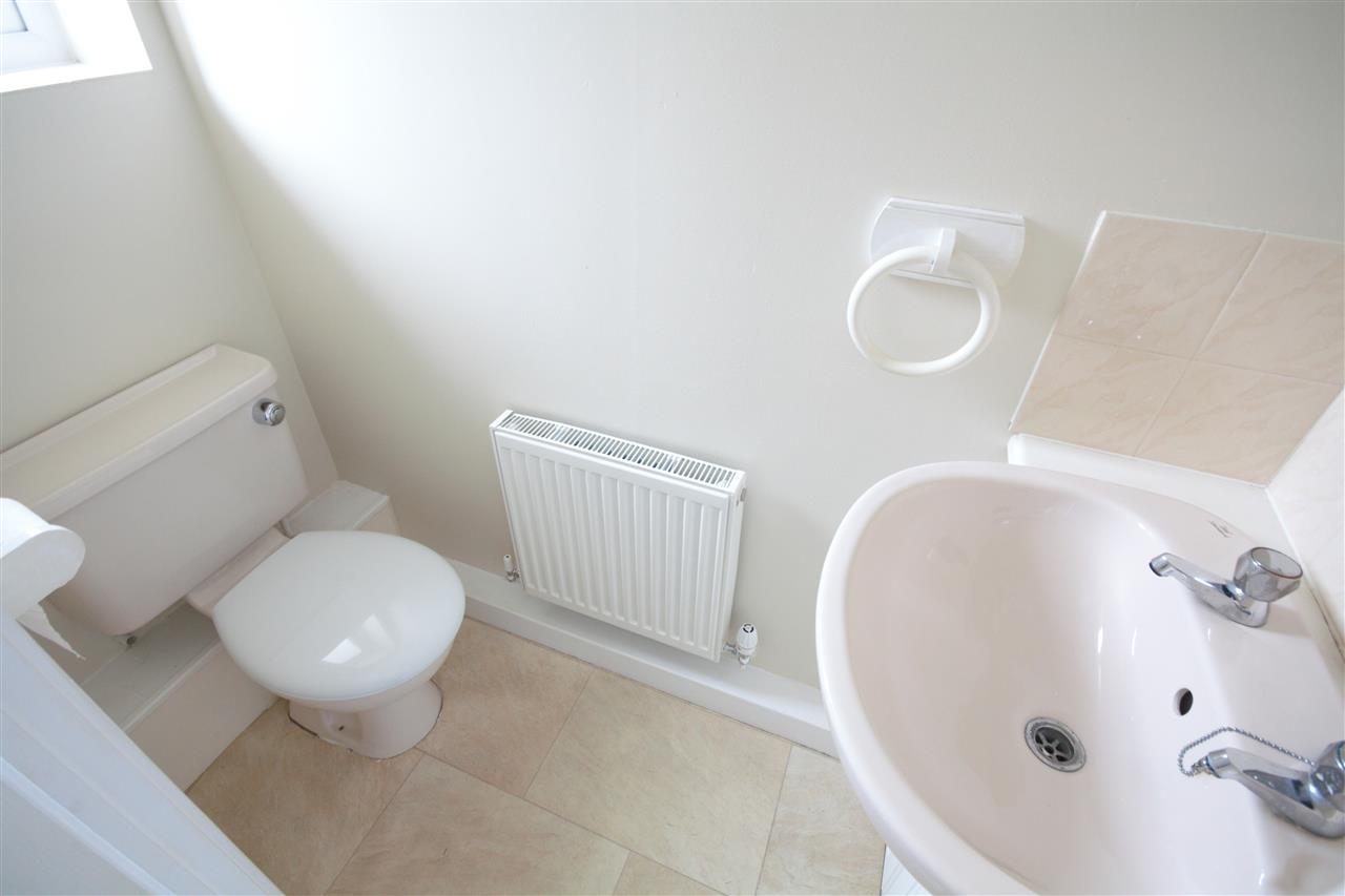 With low flush WC, pedestal wash basin with tiled splashback, central heating radiator and opaque uPVC double glazed window to the front elevation.