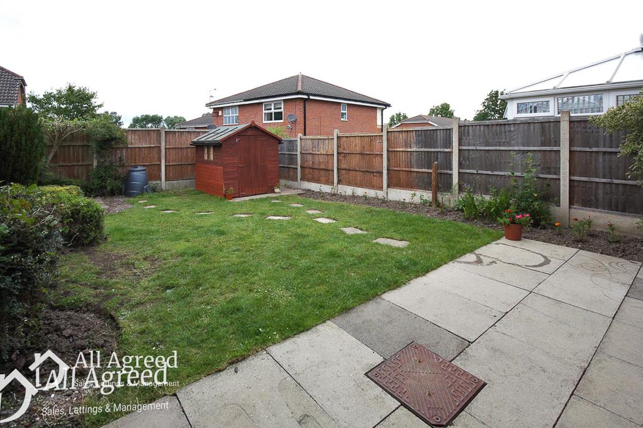 To the front there is a small lawn area with slate chipping border. Driveway to the front and side provides off road parking and leads to the gated enclosed rear garden which is mainly laid to lawn with planting borders, bushes, patio area and garden shed.