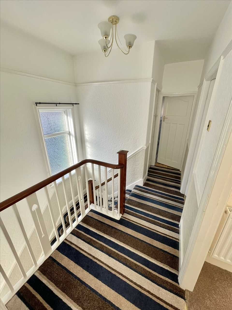 Balustrade with spindles, fitted carpet, picture rail, half landing upvc double glazed window.