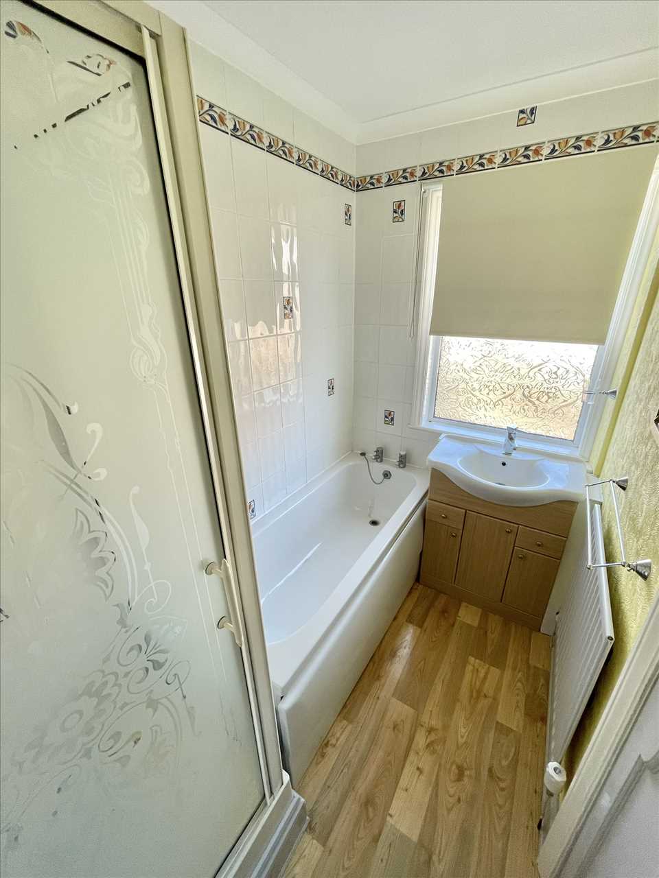 Panelled bath, shower cubicle with Triton Cara electric instant hot water shower, vanity wash hand basin, two radiators, ceiling coving, part tiled walls, vinolay flooring, upvc double glazed window, roller blind.