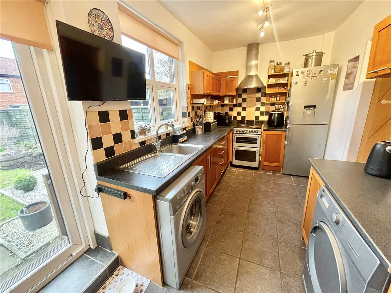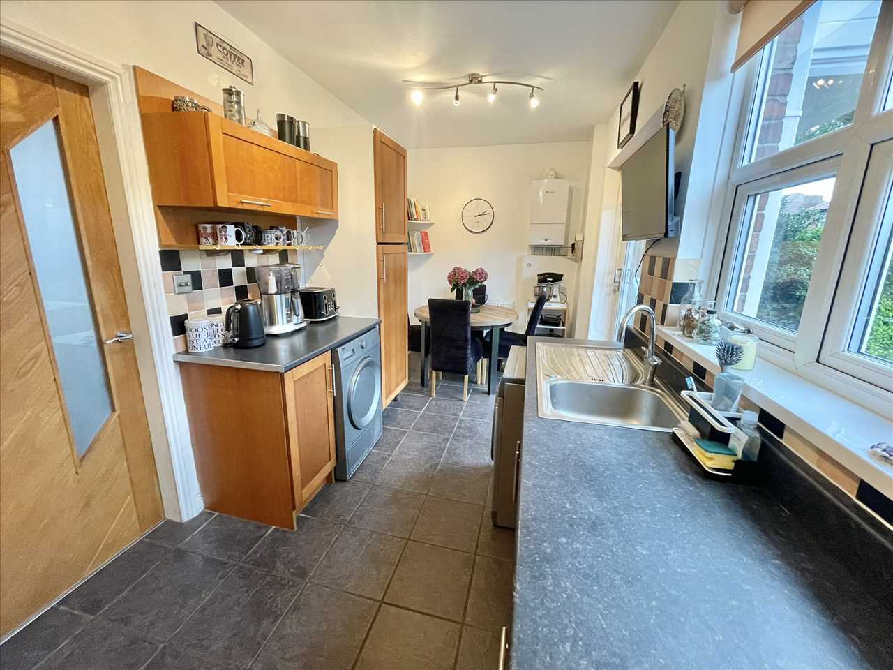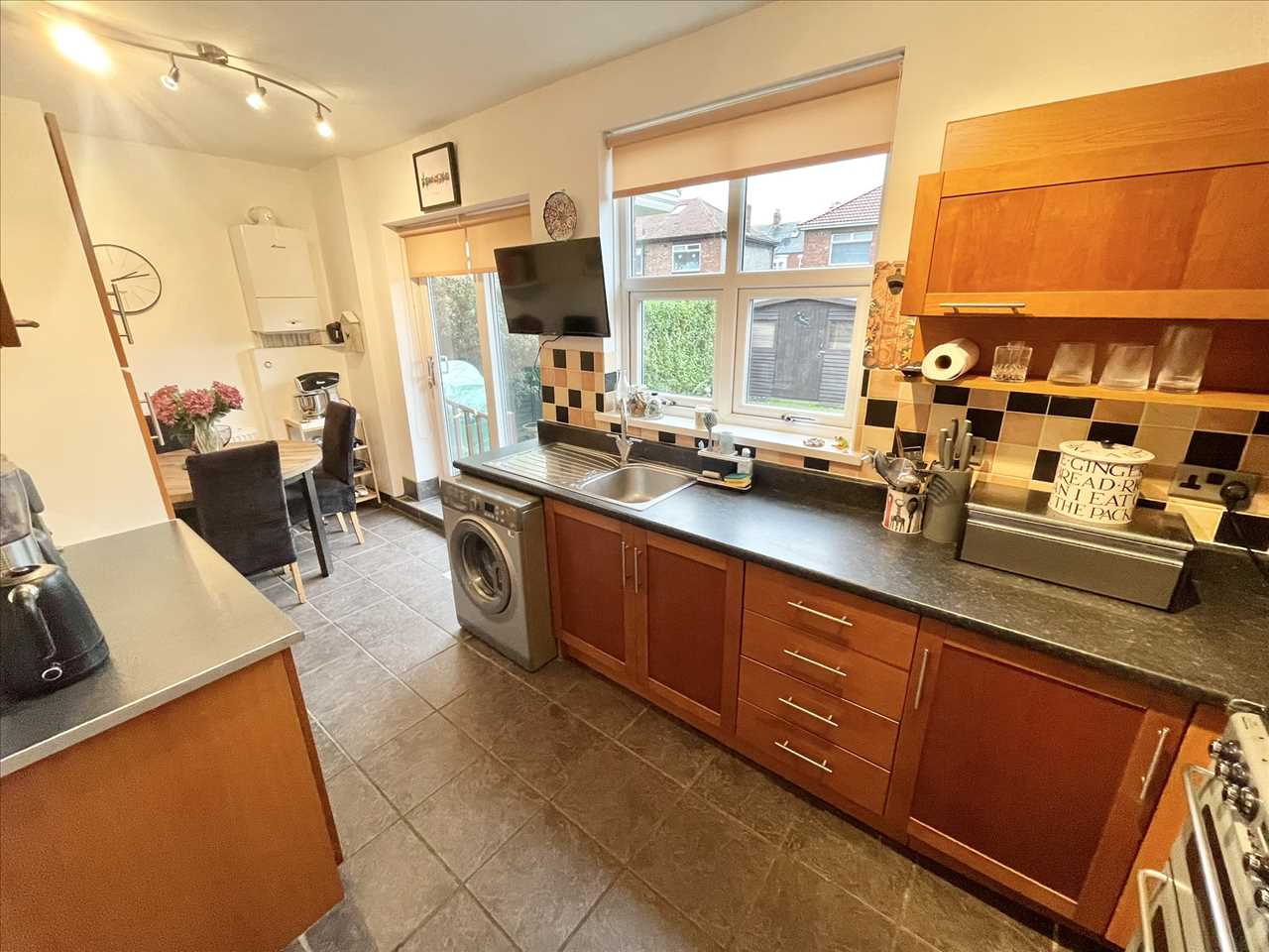 A range of wood fronted fitted wall/floor units with single drainer stainless steel sink unit with mixer tap, electric cooker point, overhead stainless steel extractor hood, complementary inset wall tiling, plumbing for washer, ceramic tiled floor, radiator, Worcester gas combination central heating boiler, upvc double glazed window, upvc double glazed sliding patio door, roller blinds.