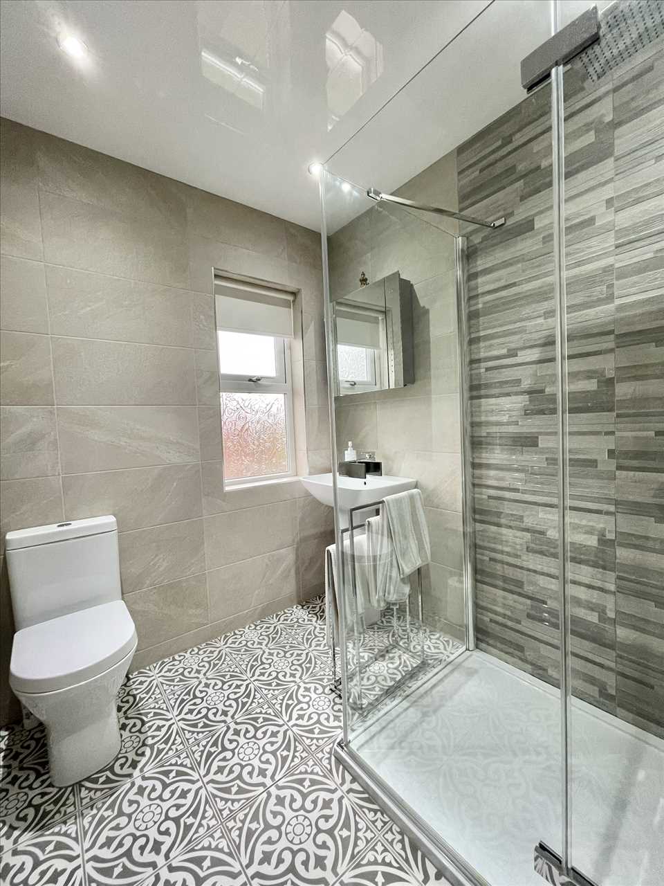 Walk in shower cubicle with overhead chrome plumbed shower and hand held spray, pedestal wash hand basin, low level w.c., fully tiled walls, pvc lined ceiling with halogen lighting, ceramic tiled floor, chrome towel radiator, upvc double glazed window, roller blind.