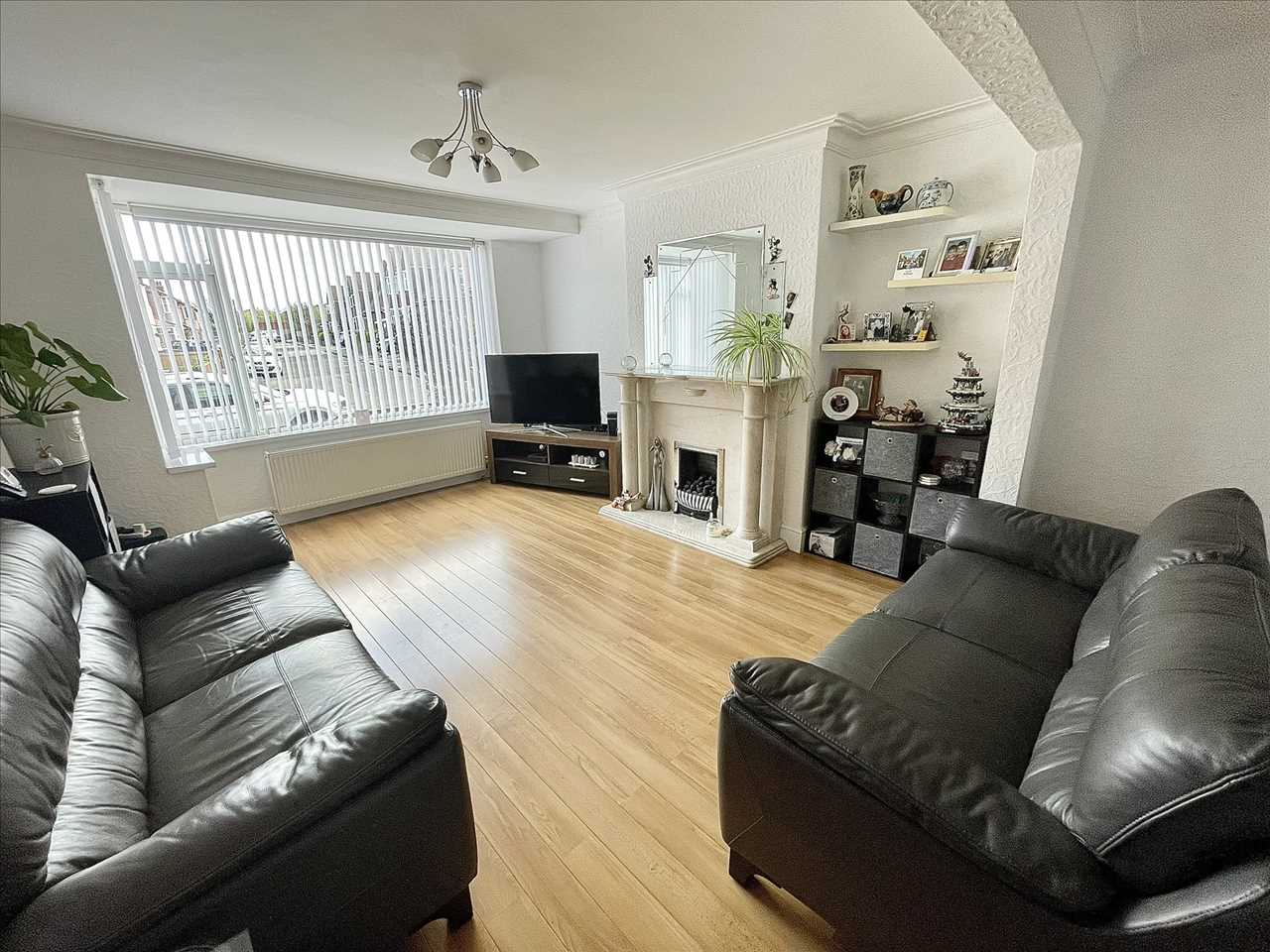 Feature marble fireplace with coal effect living flame gas fire, cottage style oak door, radiator, laminate flooring, upvc double glazed square bay window, vertical blinds, open plan to the dining room.