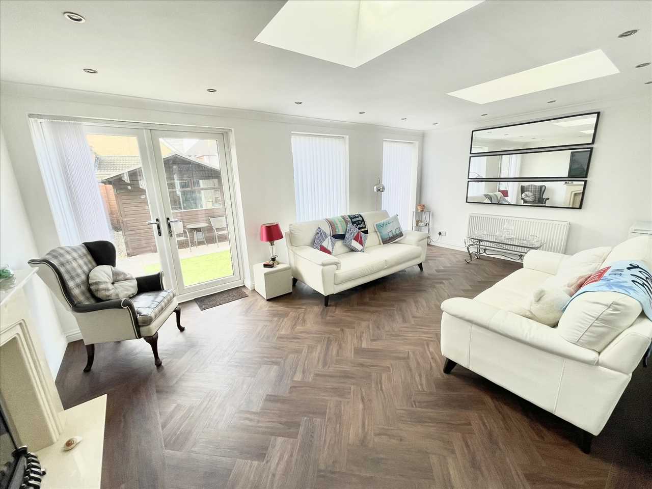 Feature marble fireplace with coal effect living flame gas fire, LVT flooring, two radiators, LED lighting, upvc double glazed windows with vertical blinds, two Velux double glazed windows, upvc double glazed patio doors.