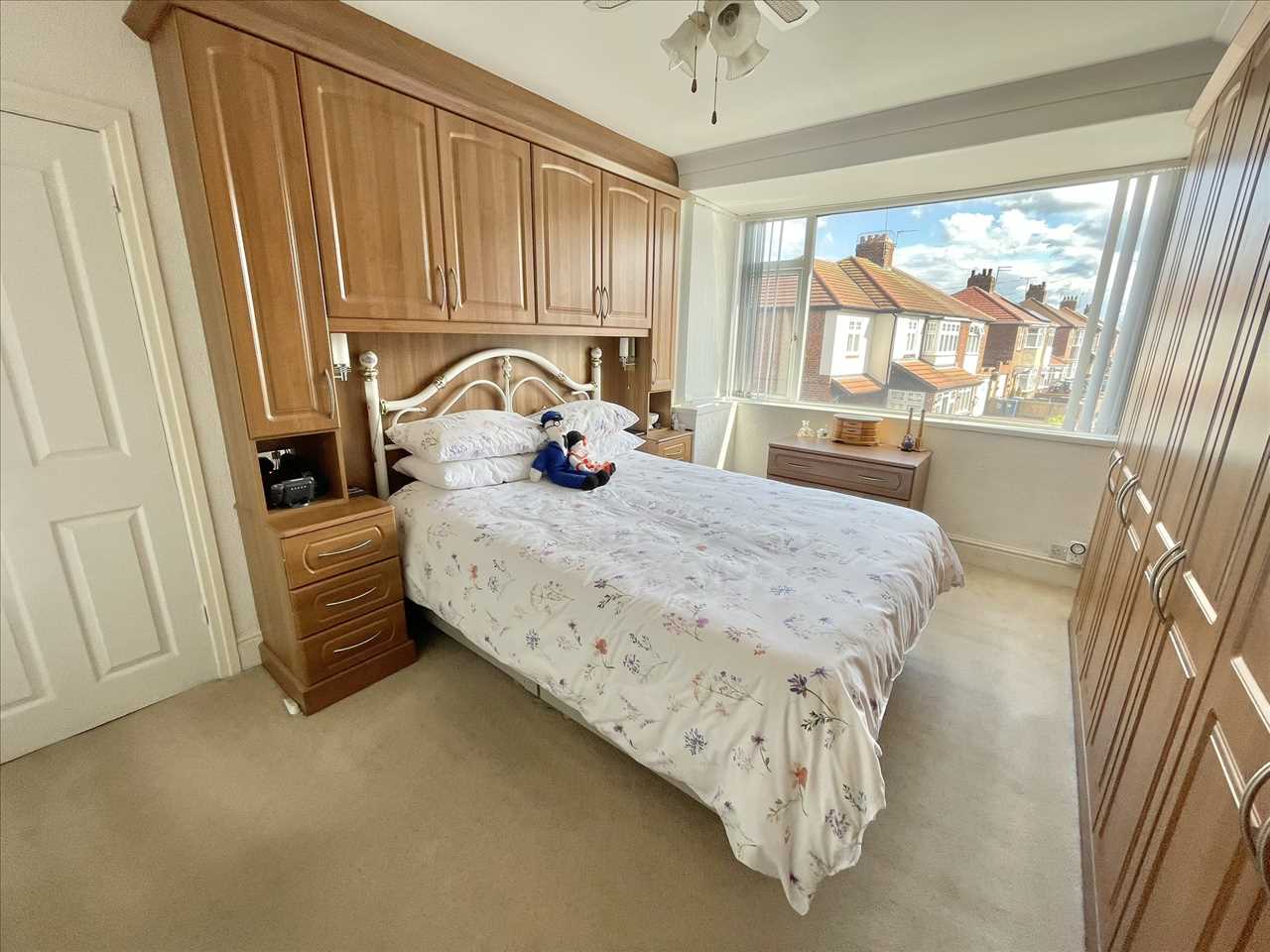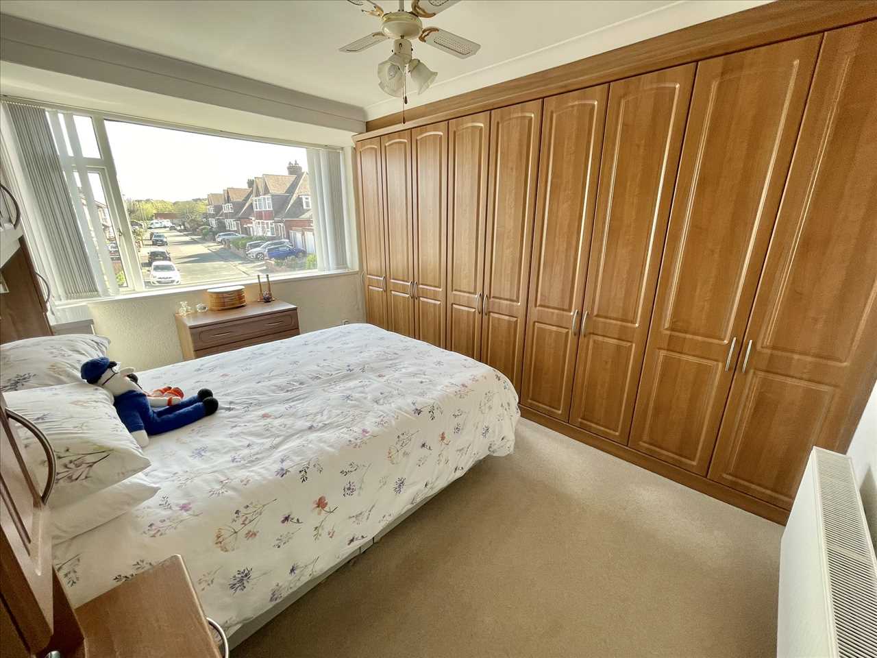 Fitted wardrobes, matching overhead cupboards, bedside cabinets and drawers, fitted carpet, radiator, upvc double glazed square bay window, vertical blinds.