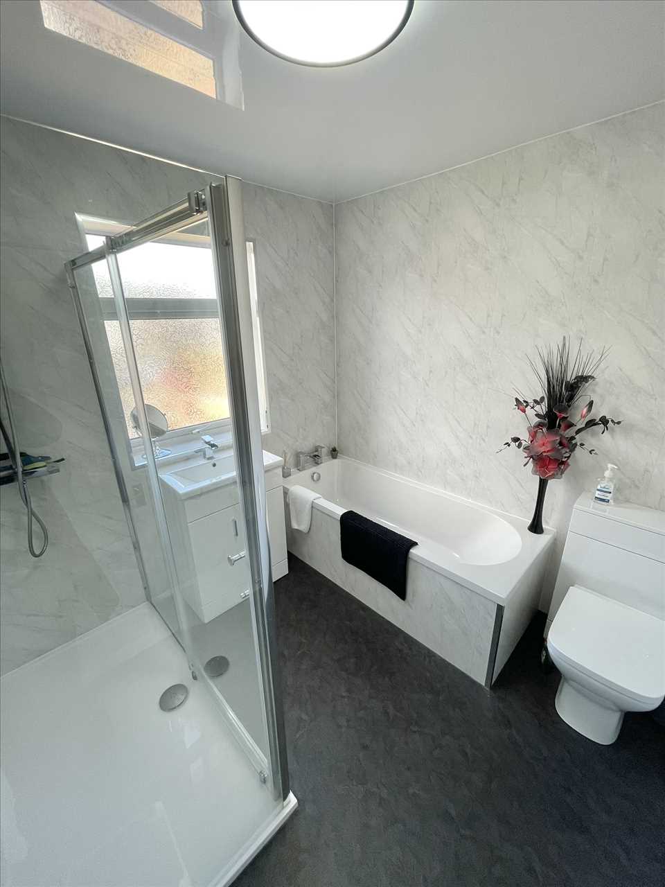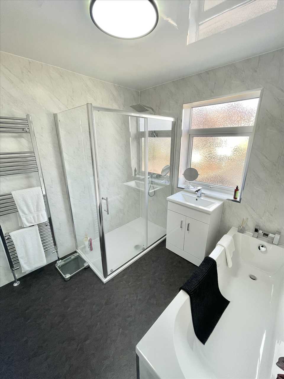 Panelled bath, back to wall toilet, vanity wash hand basin, walk in shower cubicle with chrome plumbed shower and hand held spray, chrome towel radiator, LVT flooring, pvc lined walls and ceiling, upvc double glazed window.