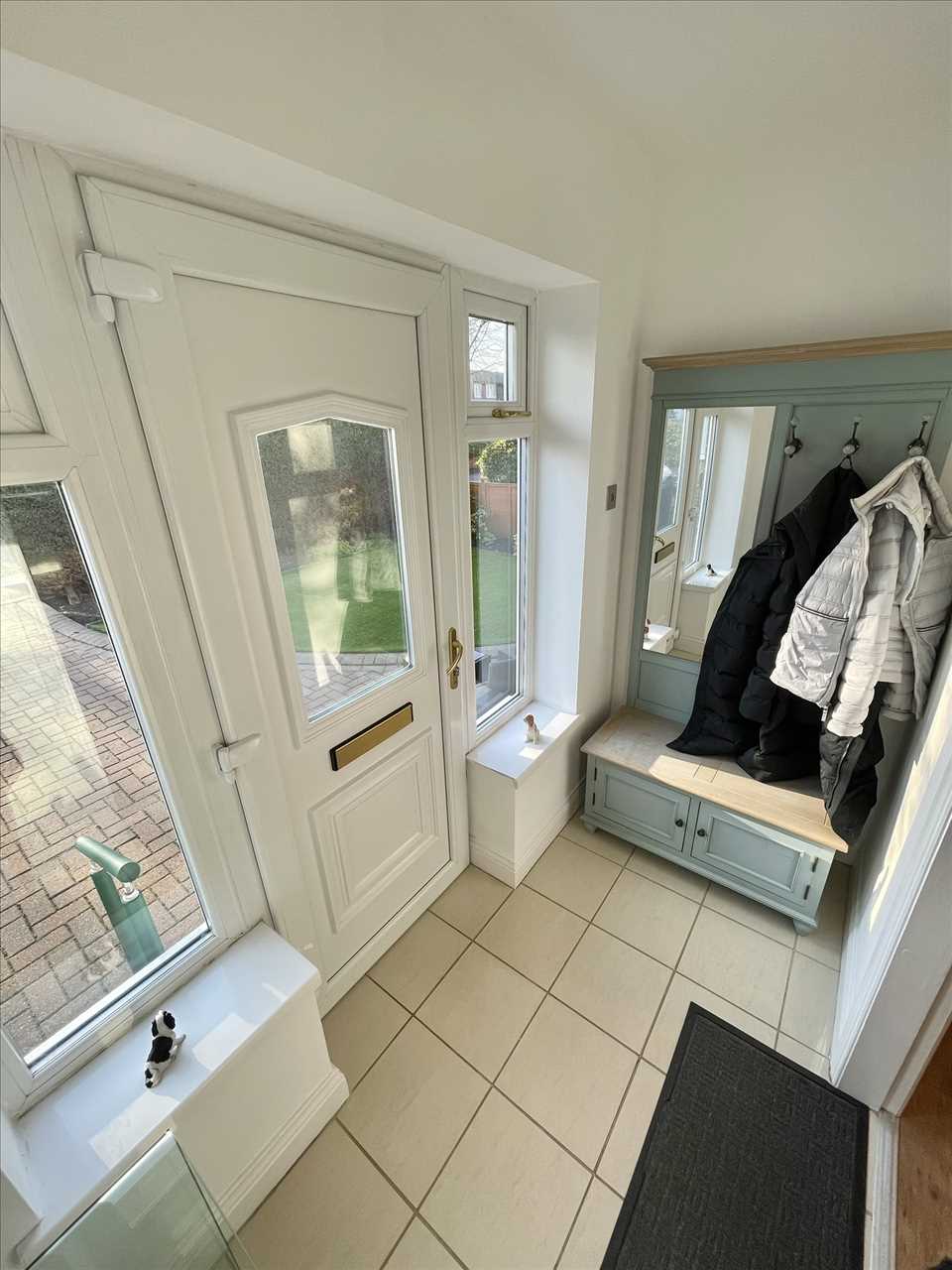 Upvc double glazed front door, upvc double glazed side windows, ceramic tiled floor, halogen lighting, part glazed oak panel door opening to the hall with Karndean flooring, radiator, halogen lighting.