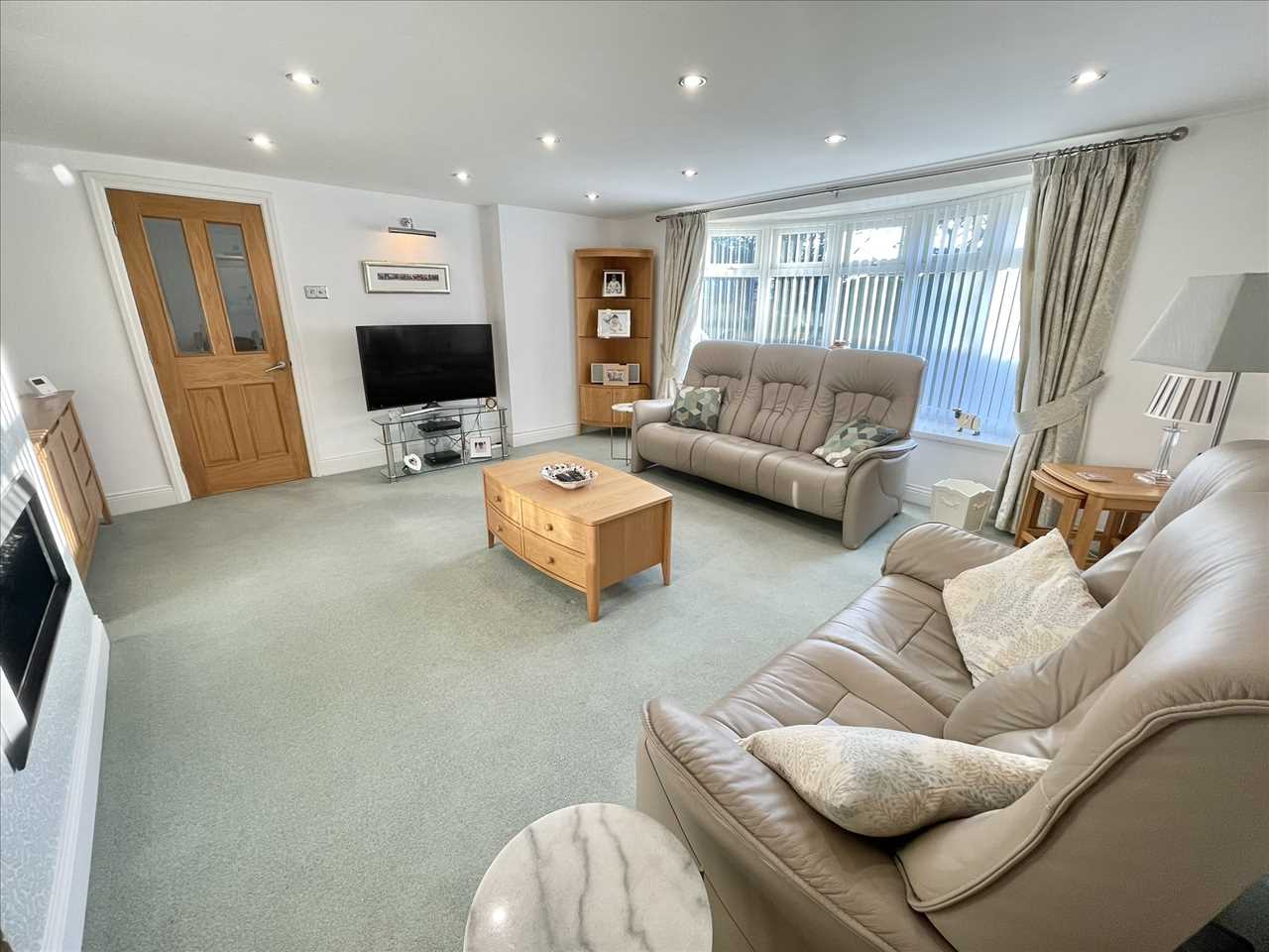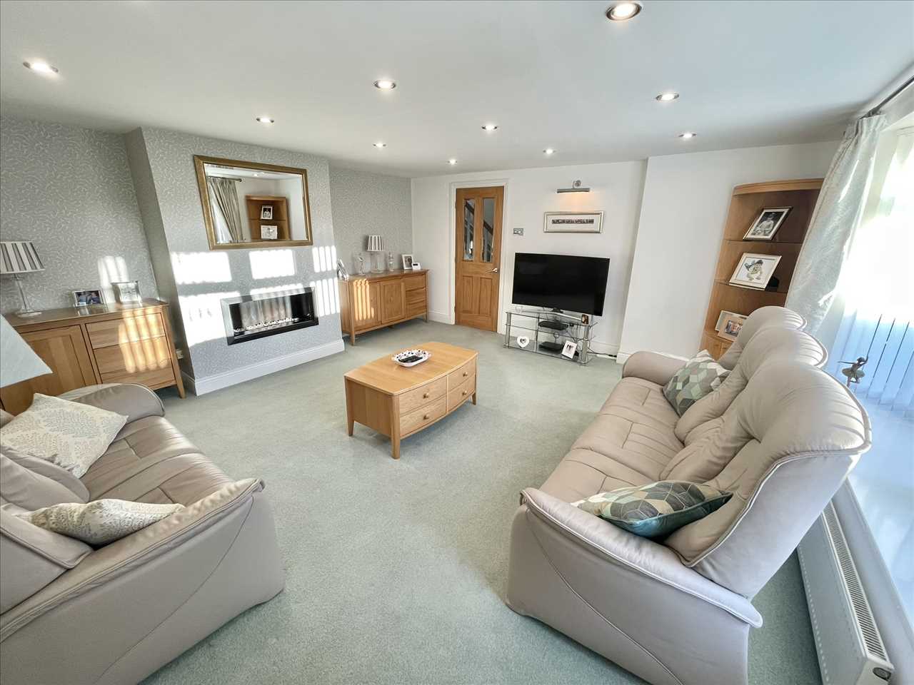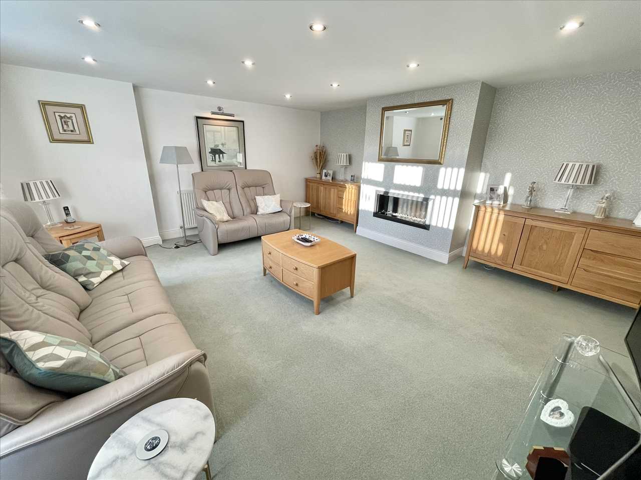 Hole in the wall style fireplace with pebble living flame gas fire, fitted carpet, halogen lighting, two twin panelled radiators, two wall lights, large upvc double glazed bow window feature, vertical blinds, part glazed oak panel door.