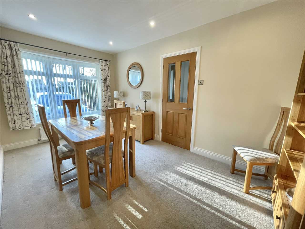 Upvc double glazed bow window, fitted carpet, radiator, vertical blinds, halogen lighting, part glazed oak panel door.