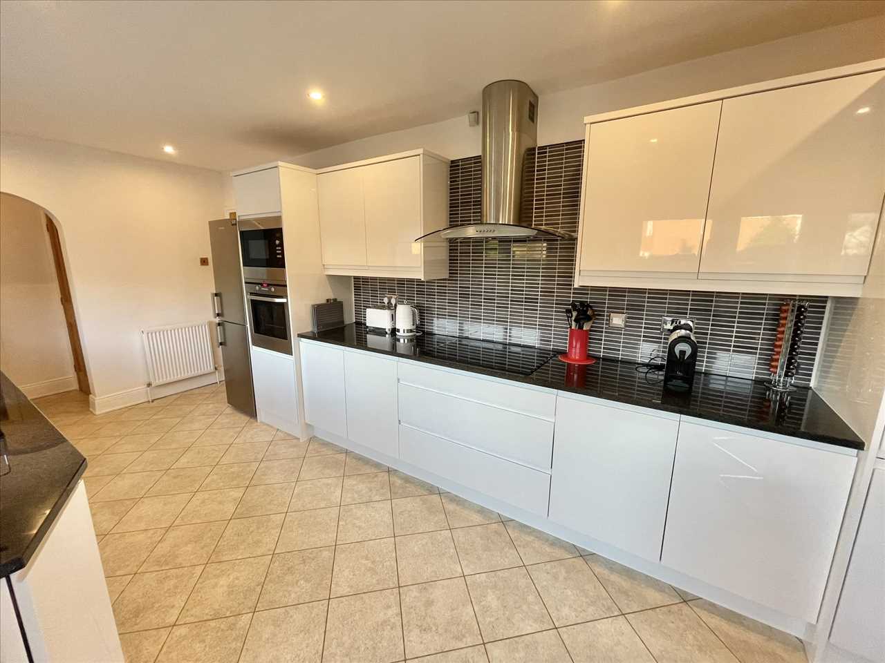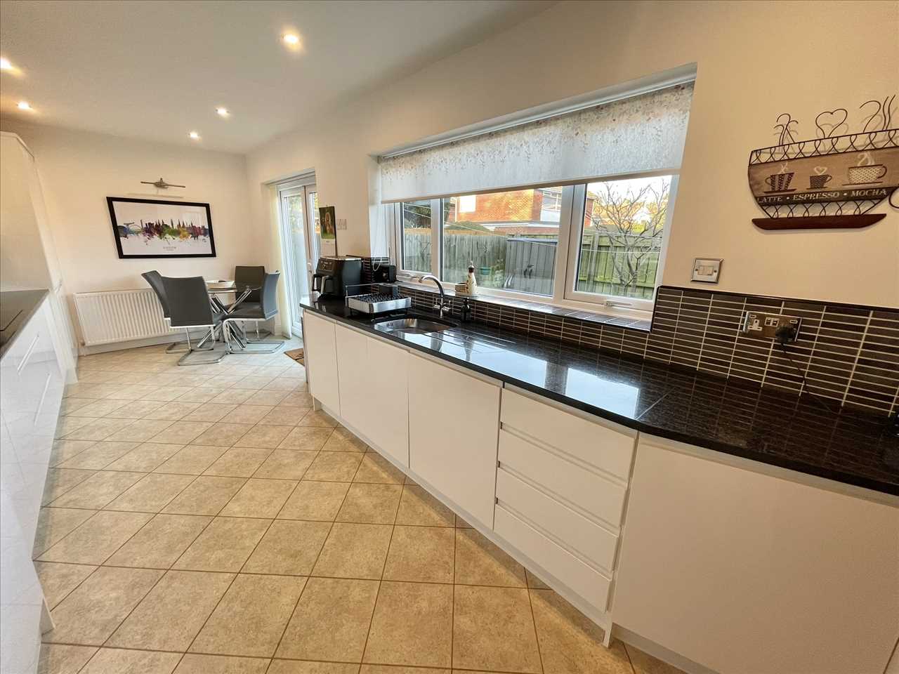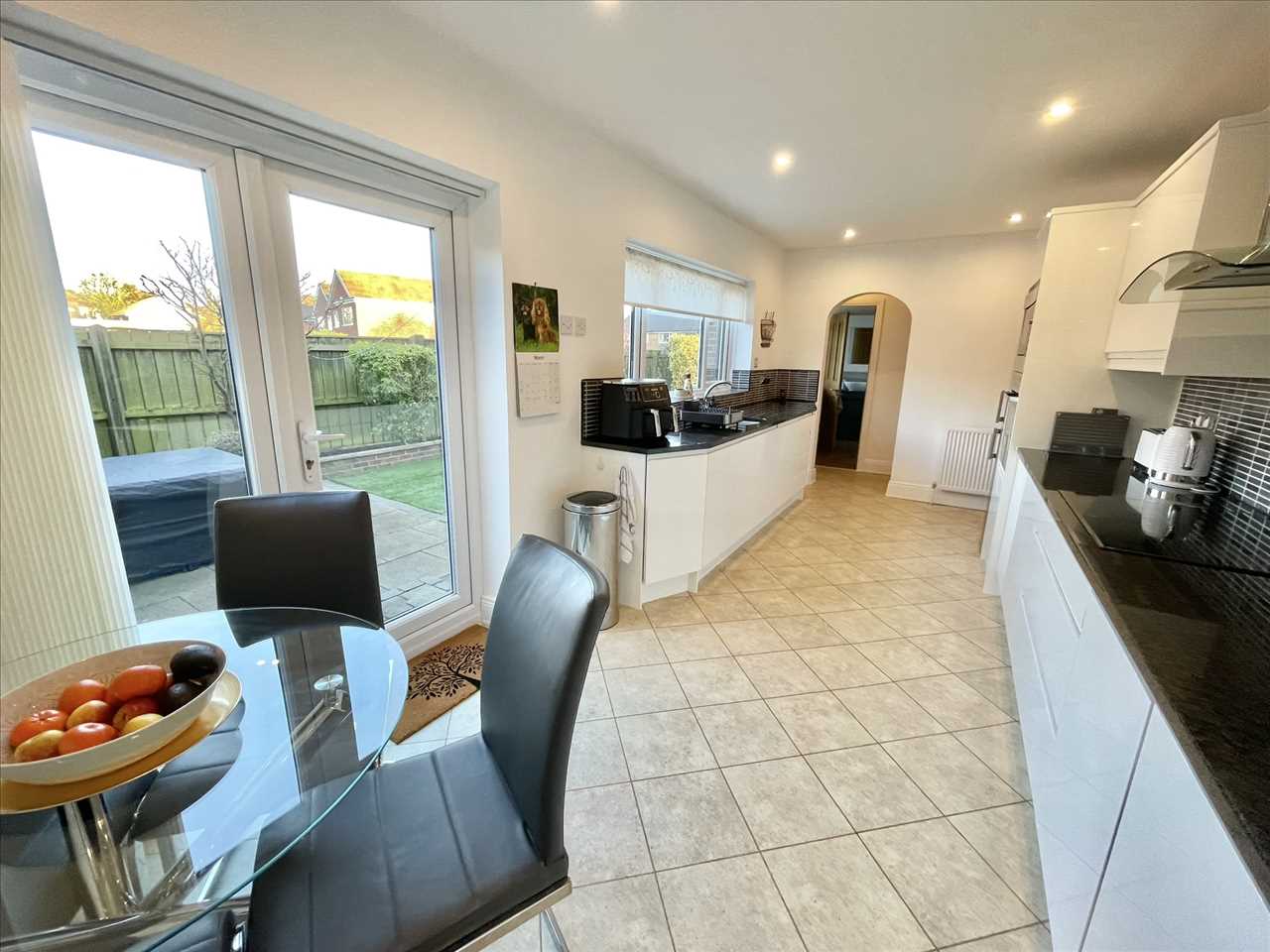 An extensive range of white high gloss fitted wall/floor units with granite work tops, single bowl stainless steel sink with mixer tap, integrated dishwasher, built in stainless steel oven and microwave, ceramic hob/stainless steel overhead extractor hood, complimentary inset wall tiling, halogen lighting, two radiators, Karndean flooring, upvc double glazed window with roller blind, upvc double glazed patio doors with vertical blinds, lobby off with upvc back door, understairs cupboard with oak wood panel door.