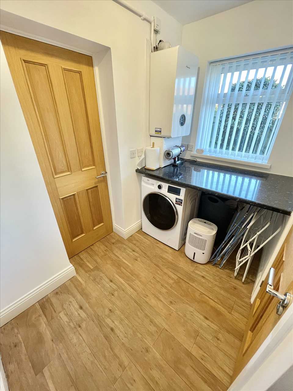 Plumbing for washer, upvc double glazed window, vertical blinds, Karndean flooring, radiator, Worcester gas combination central heating boiler, shelved cupboard, w.c. off.