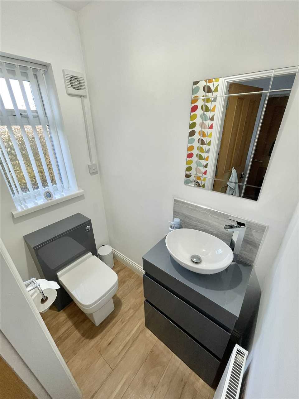 With low level w.c., vanity wash hand basin, vertical blinds, extractor fan, radiator, Karndean flooring, upvc double glazed window.