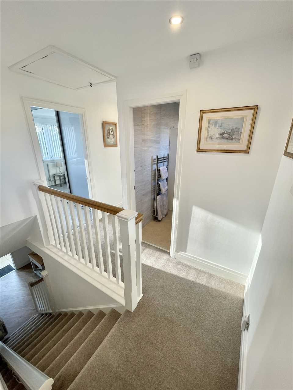 Balustrade with spindles, fitted carpet, upvc double glazed window, loft hatch with pull down ladder providing access to the floored loft space suitable for light storage purposes.