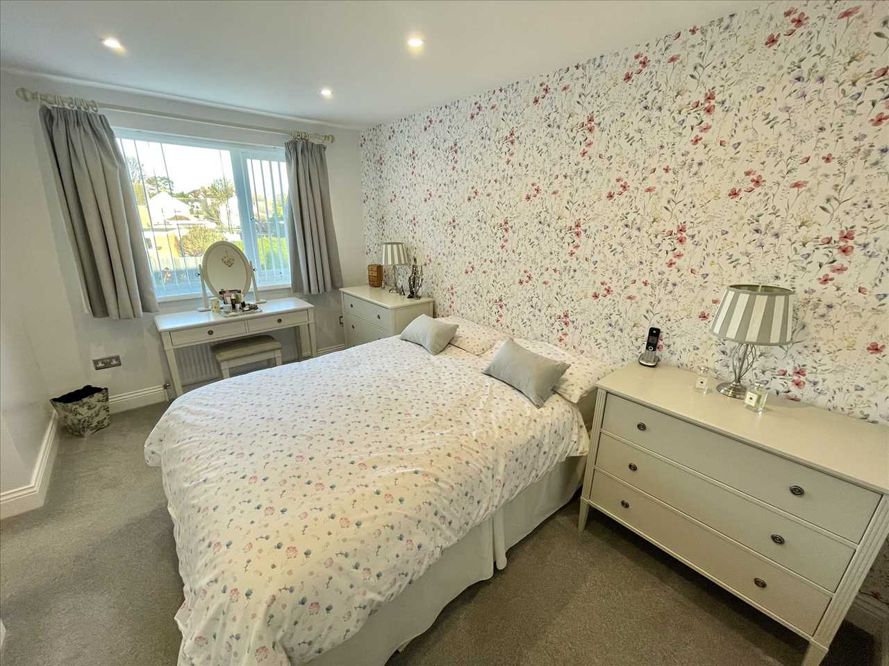 Wall to wall fitted wardrobes with sliding mirror door, fitted carpet, vertical blinds, radiator, upvc double glazed window, stairhead cupboard.