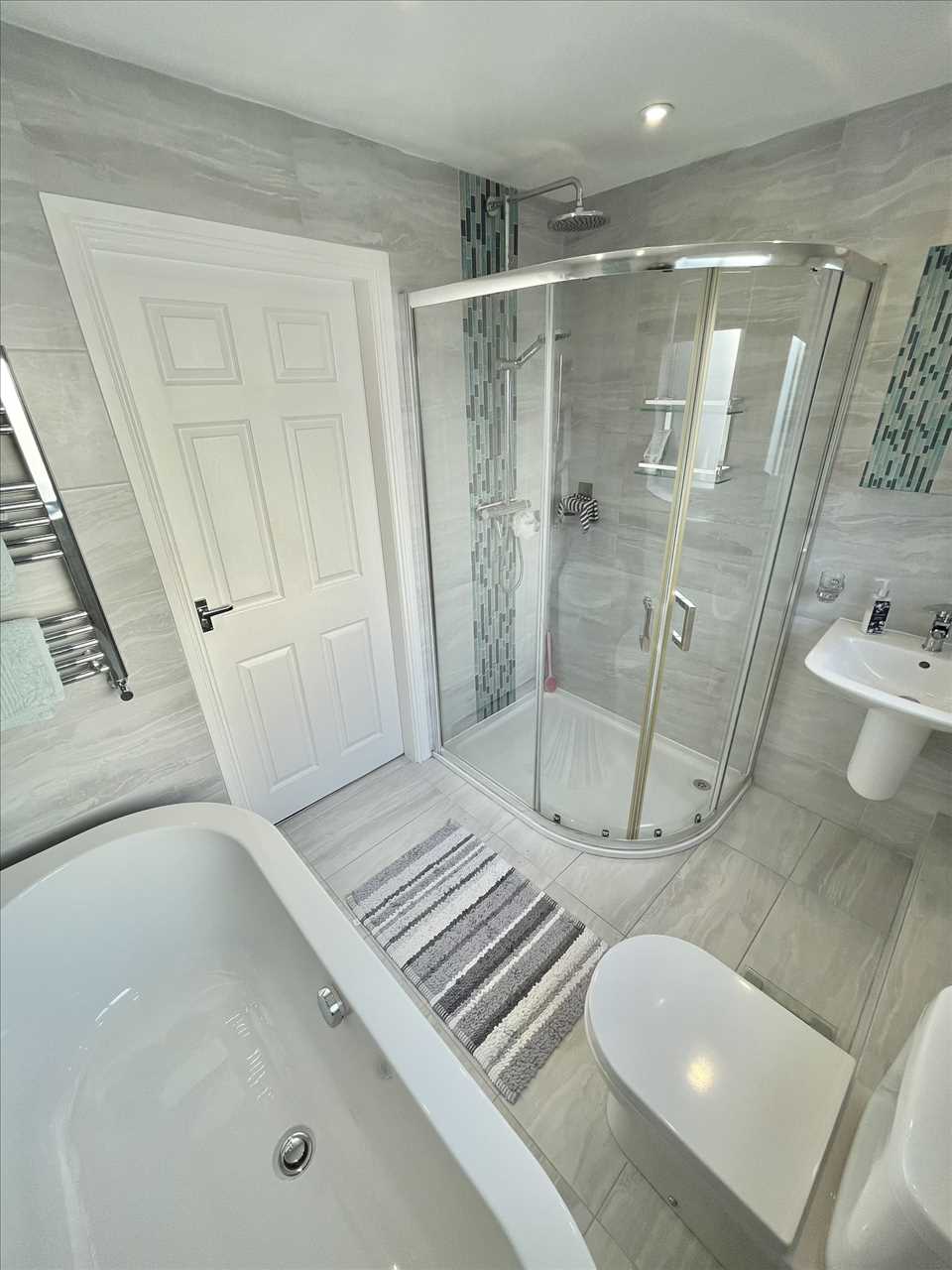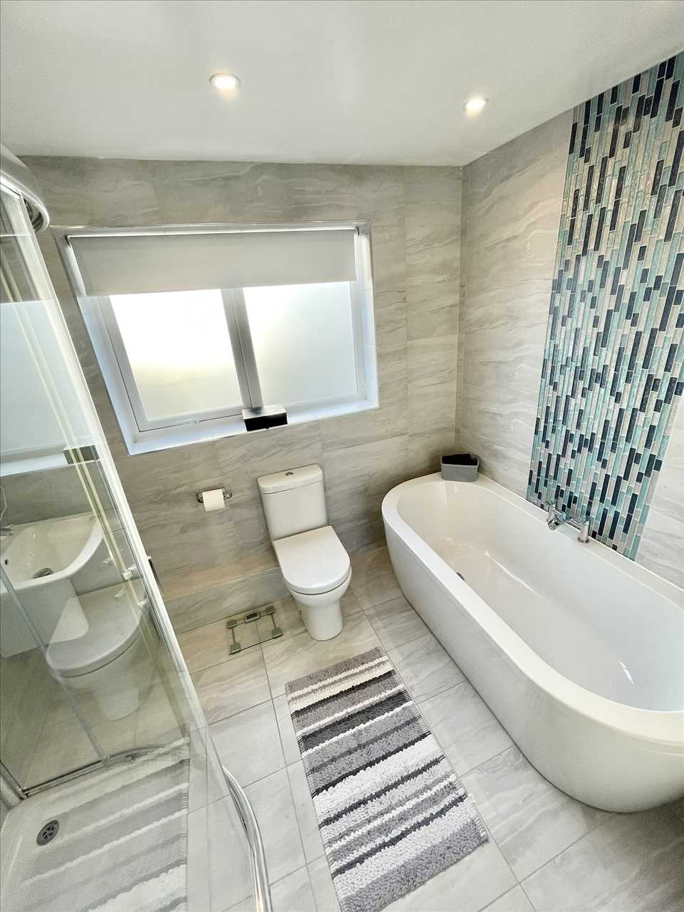 Free standing double ended panelled bath, floating wash hand basin, low level w.c., shower cubicle with chrome plumbed shower and hand held spray, halogen lighting, contrasting fully tiled walls, ceramic tiled floor, upvc double glazed window, chrome towel radiator, roller blind.