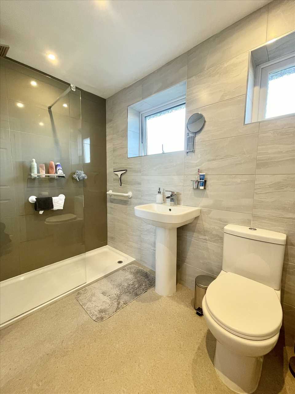 Walk in shower cubicle with chrome plumbed shower and hand held spray, pedestal wash hand basin, low level w.c., chrome towel radiator, fully tiled walls, halogen lighting, two upvc double glazed windows, vinolay flooring, ceiling extractor.