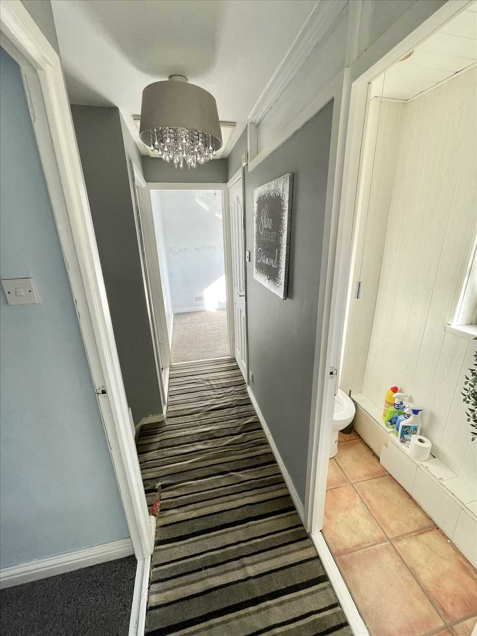 Upvc double glazed front door, fitted carpet, part wood panelled walls, inner door opening into the hall with fitted carpet, two radiators, two wall lights, delft rack, shelved/meter cupboards.