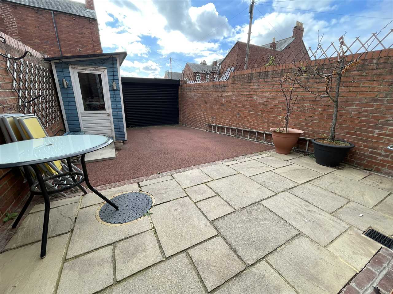 The property benefits from a block paved forecourt set behind walls with wrought iron railings and an entrance gate. To the rear, there is an enclosed car standage area with an electronically controlled roller shutter door, along with a useful shed fitted with power and exterior lighting. The outdoor space also features external power points, a paved patio area, and an additional parking space beyond the roller shutter door.