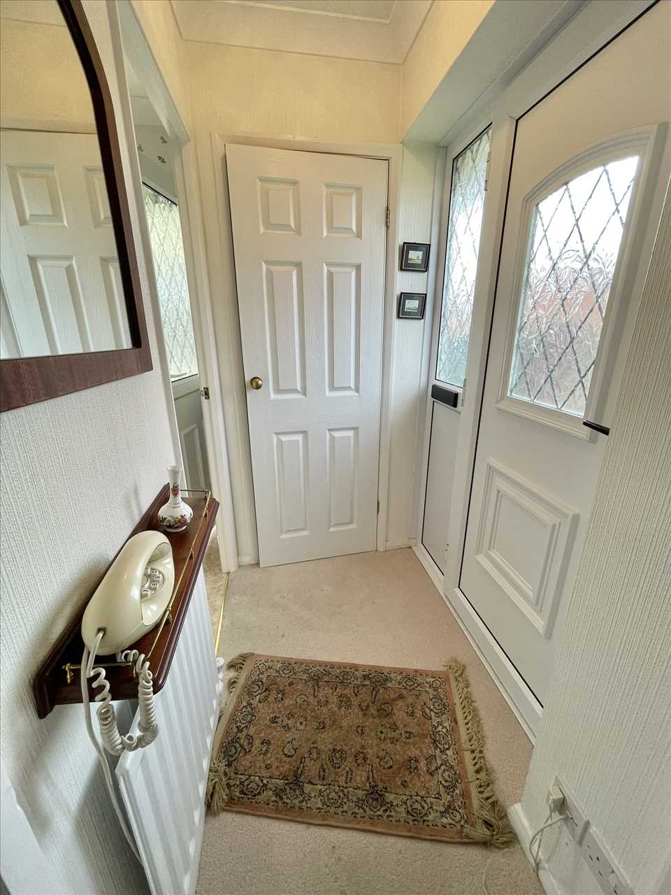 Leaded upvc double glazed front door and leaded upvc double glazed side window, fitted carpet, radiator, cupboard.