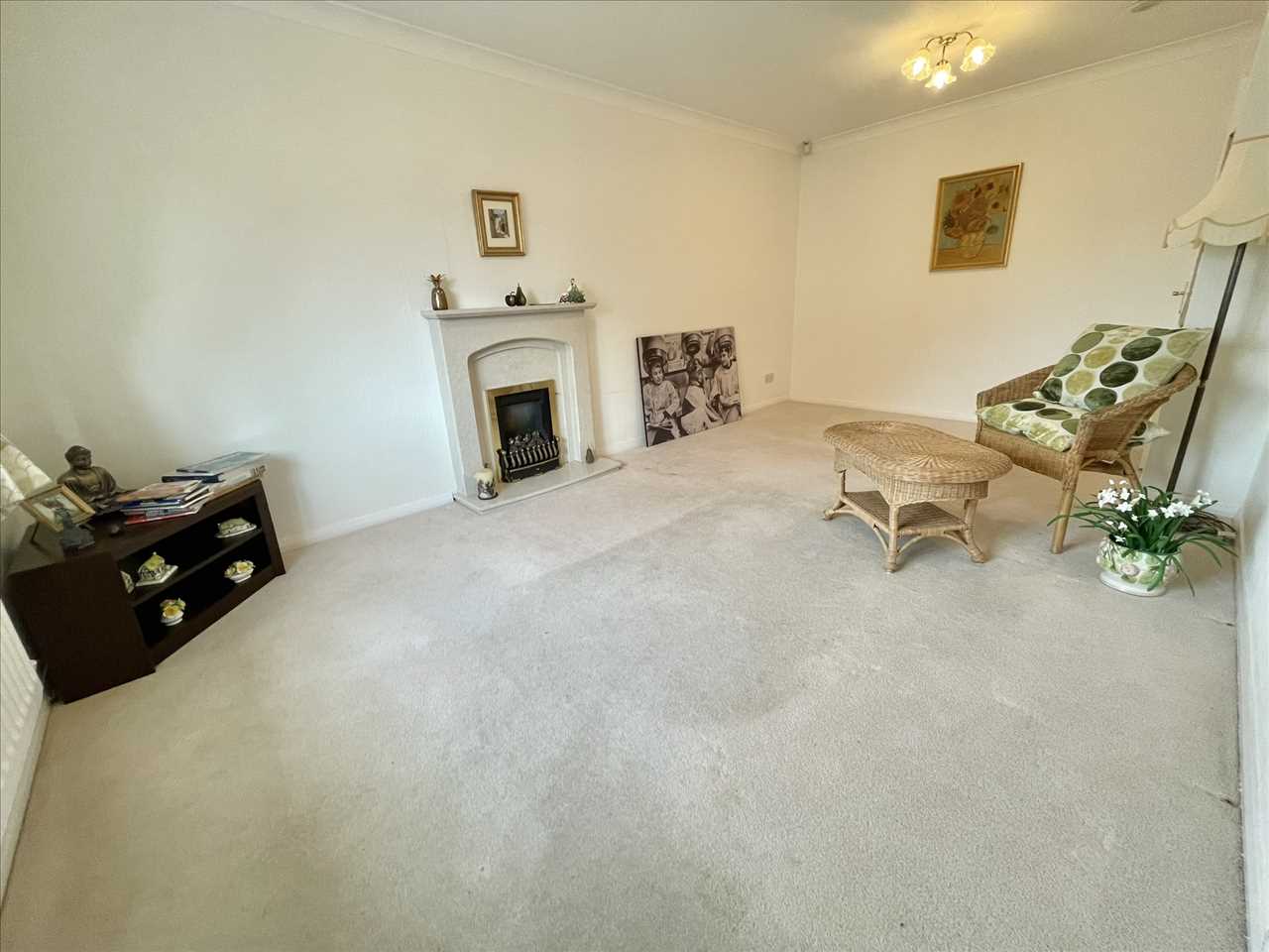 Marble fireplace surround with coal effect fire, fitted carpet, leaded upvc double glazed window, radiator.