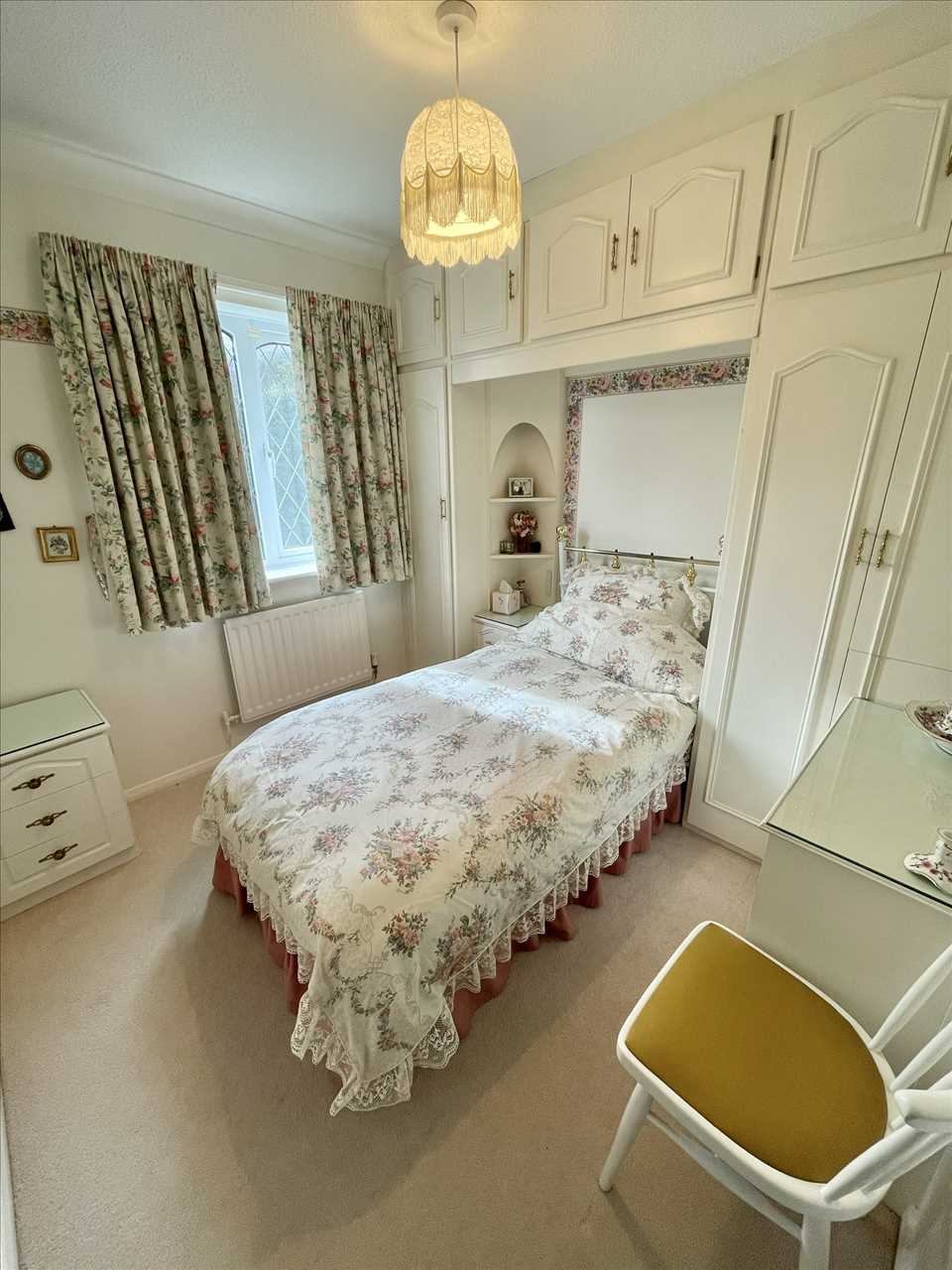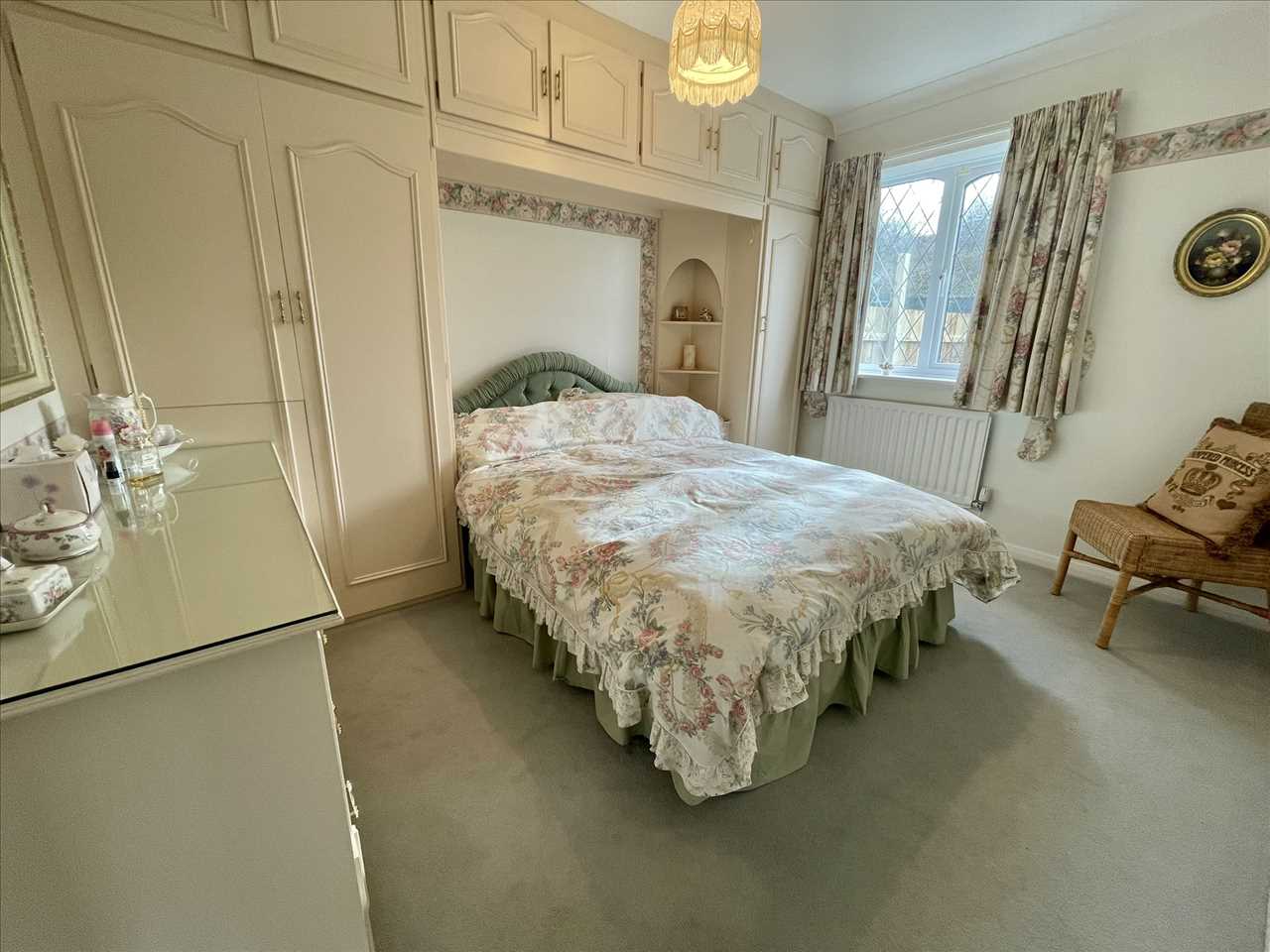 Built in wall to wall wardrobes with overhead cupboards and matching dresser, radiator, fitted carpet, leaded upvc double glazed window.
