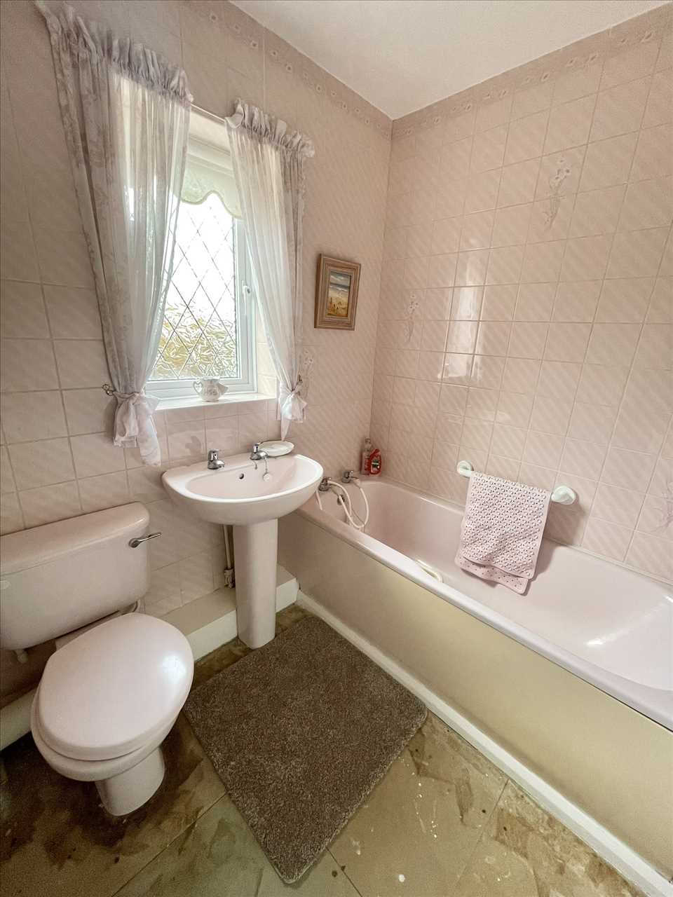 Three piece suite comprising panelled bath, pedestal wash hand basin, low level w.c., radiator, fully tiled walls, leaded upvc double glazed window.