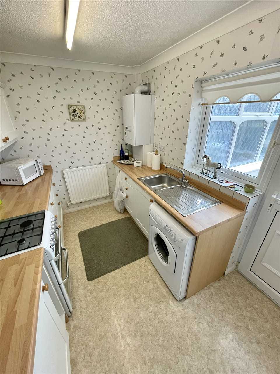 Wall/floor units, stainless steel single drainer sink unit with mixer tap, gas cooker point, radiator, vinolay flooring, plumbing for washer, Vaillant Eco Tec Pro 24 gas combination central heating boiler, upvc double glazed window, roller blinds, upvc double glazed door leading to the conservatory.